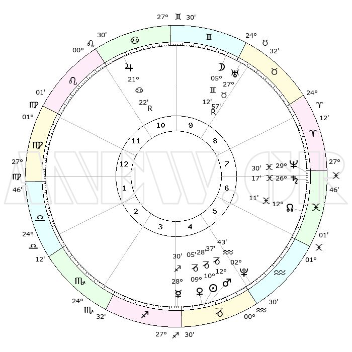 | | ΘΕΣΕΙΣ ΠΛΑΝΗΤΩΝ ΑΣΤΡΟΛΟΓΙΚΟΥ ΧΑΡΤΗ ΤΗΣ ΣΤΙΓΜΗΣ ΑΥΤΗΣ | | | | Πλανήτης | Ζώδιο | Μοίρες | Δεκαήμ. | Σε οίκο | Απόκλιση | | Ακμές των οίκων | | Ηλιος | Αιγόκερως | 10°23' | Δεύτερο | 5 | 23 S 02 | | 1ος | 04°43' | Παρθένος | | Σελήνη | Δίδυμοι | 04°01' | Πρώτο | 10 | 25 N 53 | | 2ος | 29°03' | Παρθένος | | Ερμής | Τοξότης | 28°23' | Τρίτο | 4 | 23 S 58 | | 3ος | 28°08' | Ζυγός | | Αφροδίτη | Αιγόκερως | 08°59' | Πρώτο | 5 | 23 S 38 | | 4ος | 01°05' | Τοξότης | | Αρης | Αιγόκερως | 12°34' | Δεύτερο | 5 | 23 S 44 | | 5ος | 04°58' | Αιγόκερως | | Δίας | Καρκίνος | 21°23'R | Τρίτο | 11 | 21 N 58 | | 6ος | 06°35' | Υδροχόος | | Κρόνος | Ιχθείς | 26°17' | Τρίτο | 7 | 03 S 33 | | 7ος | 04°43' | Ιχθείς | | Ουρανός | Ταύρος | 27°57'R | Τρίτο | 9 | 19 N 30 | | 8ος | 29°03' | Ιχθείς | | Ποσειδώνας | Ιχθείς | 29°30' | Τρίτο | 8 | 01 S 25 | | 9ος | 28°08' | Κριός | | Πλούτωνας | Υδροχόος | 02°43' | Πρώτο | 5 | 23 S 13 | | 10ος | 01°05' | Δίδυμοι | | Β. Δεσμός | Ιχθείς | 12°11' | Δεύτερο | 7 | 06 S 59 | | 11ος | 04°58' | Καρκίνος | | Ωροσκόπος | Παρθένος | 04°43' | Πρώτο | | | 12ος | 06°35' | Λέων | | Μεσουράνημα | Δίδυμοι | 01°05' | Πρώτο | | | |