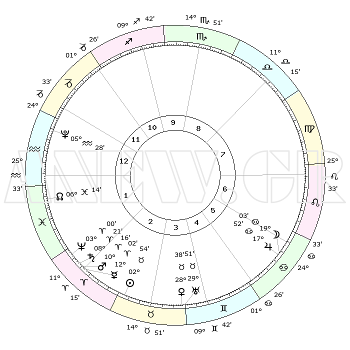 | | ΘΕΣΕΙΣ ΠΛΑΝΗΤΩΝ ΑΣΤΡΟΛΟΓΙΚΟΥ ΧΑΡΤΗ ΤΗΣ ΣΤΙΓΜΗΣ ΑΥΤΗΣ | | | | Πλανήτης | Ζώδιο | Μοίρες | Δεκαήμ. | Σε οίκο | Απόκλιση | | Ακμές των οίκων | | Ηλιος | Ταύρος | 02°51' | Πρώτο | 3 | 12 N 27 | | 1ος | 26°08' | Αιγόκερως | | Σελήνη | Καρκίνος | 18°09' | Δεύτερο | 6 | 26 N 02 | | 2ος | 09°32' | Ιχθείς | | Ερμής | Κριός | 11°56' | Δεύτερο | 2 | 02 N 23 | | 3ος | 18°33' | Κριός | | Αφροδίτη | Ταύρος | 28°33' | Τρίτο | 4 | 20 N 21 | | 4ος | 17°42' | Ταύρος | | Αρης | Κριός | 10°13' | Δεύτερο | 2 | 03 N 11 | | 5ος | 10°46' | Δίδυμοι | | Δίας | Καρκίνος | 17°52' | Δεύτερο | 6 | 22 N 37 | | 6ος | 02°04' | Καρκίνος | | Κρόνος | Κριός | 08°20' | Πρώτο | 2 | 01 N 19 | | 7ος | 26°08' | Καρκίνος | | Ουρανός | Ταύρος | 29°50' | Τρίτο | 4 | 19 N 57 | | 8ος | 09°32' | Παρθένος | | Ποσειδώνας | Κριός | 03°00' | Πρώτο | 2 | 00 S 01 | | 9ος | 18°33' | Ζυγός | | Πλούτωνας | Υδροχόος | 05°28' | Πρώτο | 1 | 22 S 48 | | 10ος | 17°42' | Σκορπιός | | Β. Δεσμός | Ιχθείς | 06°14' | Πρώτο | 1 | 09 S 13 | | 11ος | 10°46' | Τοξότης | | Ωροσκόπος | Αιγόκερως | 26°08' | Τρίτο | | | 12ος | 02°04' | Αιγόκερως | | Μεσουράνημα | Σκορπιός | 17°42' | Δεύτερο | | | |