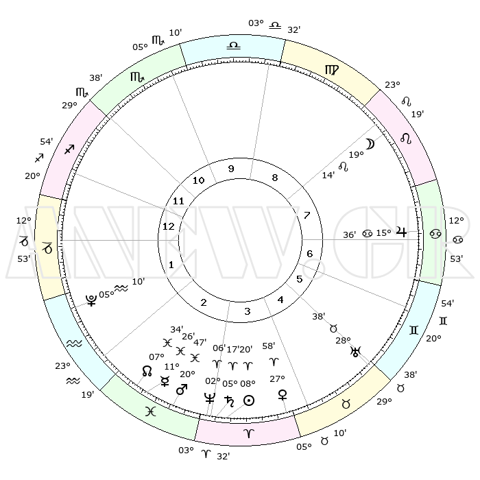 | | ΘΕΣΕΙΣ ΠΛΑΝΗΤΩΝ ΑΣΤΡΟΛΟΓΙΚΟΥ ΧΑΡΤΗ ΤΗΣ ΣΤΙΓΜΗΣ ΑΥΤΗΣ | | | | Πλανήτης | Ζώδιο | Μοίρες | Δεκαήμ. | Σε οίκο | Απόκλιση | | Ακμές των οίκων | | Ηλιος | Κριός | 08°16' | Πρώτο | 3 | 03 N 17 | | 1ος | 22°15' | Τοξότης | | Σελήνη | Λέων | 18°24' | Δεύτερο | 8 | 17 N 02 | | 2ος | 27°30' | Αιγόκερως | | Ερμής | Ιχθείς | 11°23' | Δεύτερο | 3 | 08 S 01 | | 3ος | 06°44' | Ιχθείς | | Αφροδίτη | Κριός | 27°53' | Τρίτο | 4 | 10 N 12 | | 4ος | 11°46' | Κριός | | Αρης | Ιχθείς | 20°44' | Τρίτο | 3 | 04 S 38 | | 5ος | 09°22' | Ταύρος | | Δίας | Καρκίνος | 15°36' | Δεύτερο | 7 | 22 N 53 | | 6ος | 01°46' | Δίδυμοι | | Κρόνος | Κριός | 05°17' | Πρώτο | 3 | 00 N 09 | | 7ος | 22°15' | Δίδυμοι | | Ουρανός | Ταύρος | 28°38' | Τρίτο | 5 | 19 N 41 | | 8ος | 27°30' | Καρκίνος | | Ποσειδώνας | Κριός | 02°06' | Πρώτο | 3 | 00 S 22 | | 9ος | 06°44' | Παρθένος | | Πλούτωνας | Υδροχόος | 05°10' | Πρώτο | 2 | 22 S 48 | | 10ος | 11°46' | Ζυγός | | Β. Δεσμός | Ιχθείς | 07°34' | Πρώτο | 3 | 08 S 44 | | 11ος | 09°22' | Σκορπιός | | Ωροσκόπος | Τοξότης | 22°15' | Τρίτο | | | 12ος | 01°46' | Τοξότης | | Μεσουράνημα | Ζυγός | 11°46' | Δεύτερο | | | |