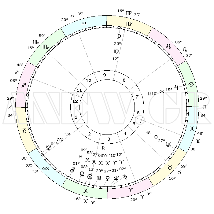 | | ΘΕΣΕΙΣ ΠΛΑΝΗΤΩΝ ΑΣΤΡΟΛΟΓΙΚΟΥ ΧΑΡΤΗ ΤΗΣ ΣΤΙΓΜΗΣ ΑΥΤΗΣ | | | | Πλανήτης | Ζώδιο | Μοίρες | Δεκαήμ. | Σε οίκο | Απόκλιση | | Ακμές των οίκων | | Ηλιος | Ιχθείς | 13°25' | Δεύτερο | 3 | 06 S 31 | | 1ος | 14°00' | Τοξότης | | Σελήνη | Παρθένος | 19°33' | Δεύτερο | 9 | 03 N 14 | | 2ος | 17°30' | Αιγόκερως | | Ερμής | Ιχθείς | 20°06'R | Τρίτο | 3 | 00 S 35 | | 3ος | 25°33' | Υδροχόος | | Αφροδίτη | Ιχθείς | 26°57' | Τρίτο | 3 | 02 S 25 | | 4ος | 01°20' | Κριός | | Αρης | Ιχθείς | 01°06' | Πρώτο | 3 | 12 S 06 | | 5ος | 00°18' | Ταύρος | | Δίας | Καρκίνος | 15°10'R | Δεύτερο | 7 | 22 N 55 | | 6ος | 23°34' | Ταύρος | | Κρόνος | Κριός | 02°12' | Πρώτο | 4 | 01 S 05 | | 7ος | 14°00' | Δίδυμοι | | Ουρανός | Ταύρος | 27°48' | Τρίτο | 6 | 19 N 29 | | 8ος | 17°30' | Καρκίνος | | Ποσειδώνας | Κριός | 01°09' | Πρώτο | 3 | 00 S 44 | | 9ος | 25°33' | Λέων | | Πλούτωνας | Υδροχόος | 04°37' | Πρώτο | 2 | 22 S 52 | | 10ος | 01°20' | Ζυγός | | Β. Δεσμός | Ιχθείς | 08°53' | Πρώτο | 3 | 08 S 14 | | 11ος | 00°18' | Σκορπιός | | Ωροσκόπος | Τοξότης | 14°00' | Δεύτερο | | | 12ος | 23°34' | Σκορπιός | | Μεσουράνημα | Ζυγός | 01°20' | Πρώτο | | | |