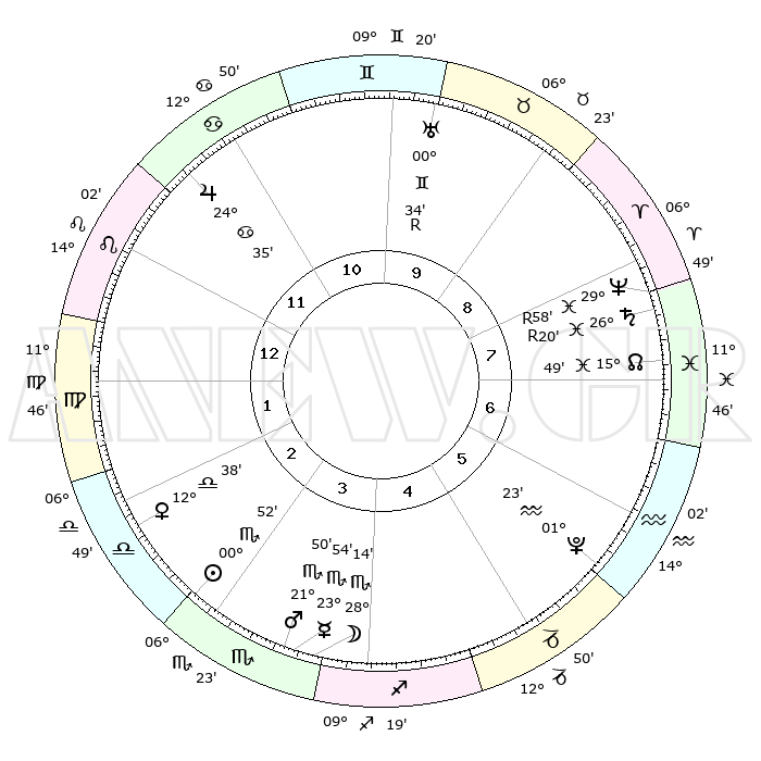 | ΘΕΣΕΙΣ ΠΛΑΝΗΤΩΝ ΑΣΤΡΟΛΟΓΙΚΟΥ ΧΑΡΤΗ ΤΗΣ ΣΤΙΓΜΗΣ ΑΥΤΗΣ | | Πλανήτης | Ζώδιο | Μοίρες | Δεκαήμ. | Σε οίκο | Απόκλιση | | Ακμές των οίκων | Ηλιος | Σκορπιός | 00°43' | Πρώτο | 4 | 11 S 43 | | 1ος | 27°07' | Καρκίνος | Σελήνη | Σκορπιός | 26°25' | Τρίτο | 5 | 24 S 00 | | 2ος | 17°59' | Λέων | Ερμής | Σκορπιός | 23°43' | Τρίτο | 5 | 21 S 10 | | 3ος | 12°39' | Παρθένος | Αφροδίτη | Ζυγός | 12°26' | Δεύτερο | 3 | 03 S 30 | | 4ος | 13°18' | Ζυγός | Αρης | Σκορπιός | 21°43' | Τρίτο | 5 | 18 S 30 | | 5ος | 19°24' | Σκορπιός | Δίας | Καρκίνος | 24°35' | Τρίτο | 12 | 21 N 16 | | 6ος | 25°35' | Τοξότης | Κρόνος | Ιχθείς | 26°20'R | Τρίτο | 9 | 03 S 44 | | 7ος | 27°07' | Αιγόκερως | Ουρανός | Δίδυμοι | 00°34'R | Πρώτο | 11 | 20 N 04 | | 8ος | 17°59' | Υδροχόος | Ποσειδώνας | Ιχθείς | 29°58'R | Τρίτο | 9 | 01 S 16 | | 9ος | 12°39' | Ιχθείς | Πλούτωνας | Υδροχόος | 01°23' | Πρώτο | 7 | 23 S 32 | | 10ος | 13°18' | Κριός | Β. Δεσμός | Ιχθείς | 15°50' | Δεύτερο | 9 | 05 S 35 | | 11ος | 19°24' | Ταύρος | Ωροσκόπος | Καρκίνος | 27°07' | Τρίτο | | | 12ος | 25°35' | Δίδυμοι | Μεσουράνημα | Κριός | 13°18' | Δεύτερο | | | |