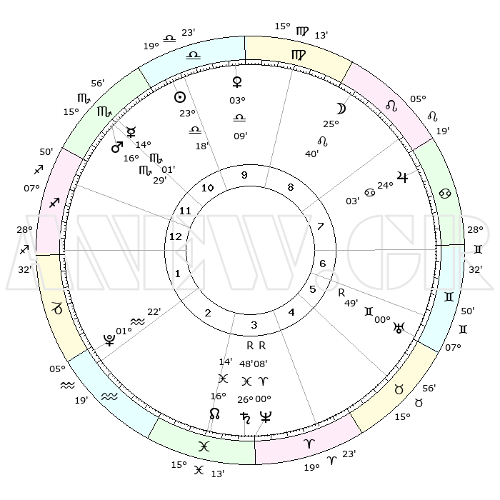 | ΘΕΣΕΙΣ ΠΛΑΝΗΤΩΝ ΑΣΤΡΟΛΟΓΙΚΟΥ ΧΑΡΤΗ ΤΗΣ ΣΤΙΓΜΗΣ ΑΥΤΗΣ | | Πλανήτης | Ζώδιο | Μοίρες | Δεκαήμ. | Σε οίκο | Απόκλιση | | Ακμές των οίκων | Ηλιος | Ζυγός | 23°08' | Τρίτο | 12 | 08 S 59 | | 1ος | 11°55' | Σκορπιός | Σελήνη | Λέων | 23°41' | Τρίτο | 10 | 15 N 39 | | 2ος | 11°09' | Τοξότης | Ερμής | Σκορπιός | 13°48' | Δεύτερο | 1 | 17 S 45 | | 3ος | 14°15' | Αιγόκερως | Αφροδίτη | Ζυγός | 02°57' | Πρώτο | 11 | 00 N 13 | | 4ος | 19°19' | Υδροχόος | Αρης | Σκορπιός | 16°23' | Δεύτερο | 1 | 16 S 58 | | 5ος | 21°54' | Ιχθείς | Δίας | Καρκίνος | 24°02' | Τρίτο | 9 | 21 N 21 | | 6ος | 19°19' | Κριός | Κρόνος | Ιχθείς | 26°48'R | Τρίτο | 5 | 03 S 34 | | 7ος | 11°55' | Ταύρος | Ουρανός | Δίδυμοι | 00°49'R | Πρώτο | 7 | 20 N 07 | | 8ος | 11°09' | Δίδυμοι | Ποσειδώνας | Κριός | 00°09'R | Πρώτο | 5 | 01 S 12 | | 9ος | 14°15' | Καρκίνος | Πλούτωνας | Υδροχόος | 01°22' | Πρώτο | 3 | 23 S 32 | | 10ος | 19°19' | Λέων | Β. Δεσμός | Ιχθείς | 16°14' | Δεύτερο | 4 | 05 S 26 | | 11ος | 21°54' | Παρθένος | Ωροσκόπος | Σκορπιός | 11°55' | Δεύτερο | | | 12ος | 19°19' | Ζυγός | Μεσουράνημα | Λέων | 19°19' | Δεύτερο | | | |