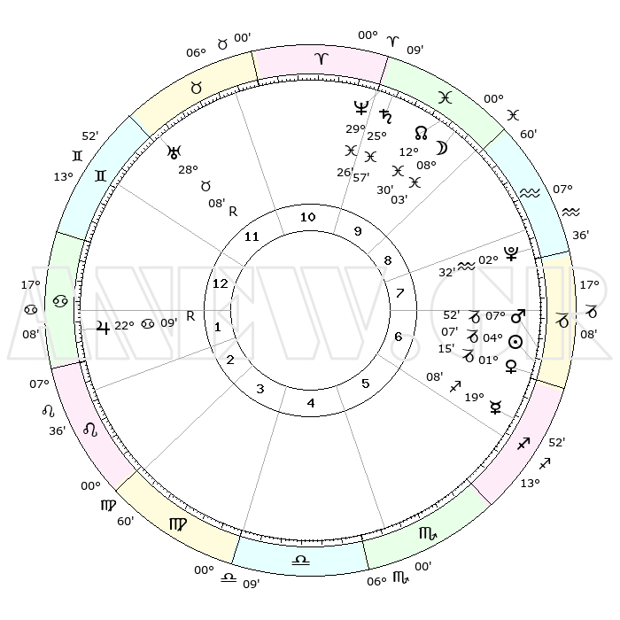| | ΘΕΣΕΙΣ ΠΛΑΝΗΤΩΝ ΑΣΤΡΟΛΟΓΙΚΟΥ ΧΑΡΤΗ ΤΗΣ ΣΤΙΓΜΗΣ ΑΥΤΗΣ | | | | Πλανήτης | Ζώδιο | Μοίρες | Δεκαήμ. | Σε οίκο | Απόκλιση | | Ακμές των οίκων | | Ηλιος | Αιγόκερως | 04°03' | Πρώτο | 7 | 23 S 22 | | 1ος | 22°16' | Δίδυμοι | | Σελήνη | Ιχθείς | 07°03' | Πρώτο | 10 | 09 S 16 | | 2ος | 13°40' | Καρκίνος | | Ερμής | Τοξότης | 19°01' | Δεύτερο | 6 | 22 S 48 | | 3ος | 05°05' | Λέων | | Αφροδίτη | Αιγόκερως | 01°10' | Πρώτο | 7 | 23 S 41 | | 4ος | 00°14' | Παρθένος | | Αρης | Αιγόκερως | 07°48' | Πρώτο | 7 | 24 S 03 | | 5ος | 02°50' | Ζυγός | | Δίας | Καρκίνος | 22°10'R | Τρίτο | 2 | 21 N 50 | | 6ος | 13°08' | Σκορπιός | | Κρόνος | Ιχθείς | 25°57' | Τρίτο | 10 | 03 S 42 | | 7ος | 22°16' | Τοξότης | | Ουρανός | Ταύρος | 28°08'R | Τρίτο | 12 | 19 N 33 | | 8ος | 13°40' | Αιγόκερως | | Ποσειδώνας | Ιχθείς | 29°26' | Τρίτο | 10 | 01 S 27 | | 9ος | 05°05' | Υδροχόος | | Πλούτωνας | Υδροχόος | 02°32' | Πρώτο | 8 | 23 S 16 | | 10ος | 00°14' | Ιχθείς | | Β. Δεσμός | Ιχθείς | 12°30' | Δεύτερο | 10 | 06 S 52 | | 11ος | 02°50' | Κριός | | Ωροσκόπος | Δίδυμοι | 22°16' | Τρίτο | | | 12ος | 13°08' | Ταύρος | | Μεσουράνημα | Ιχθείς | 00°14' | Πρώτο | | | |