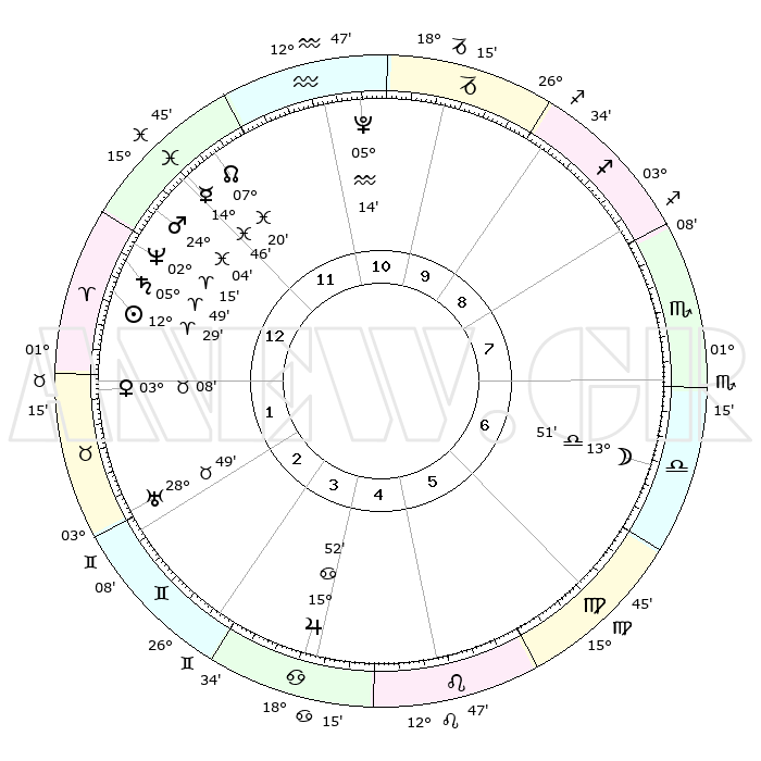 | | ΘΕΣΕΙΣ ΠΛΑΝΗΤΩΝ ΑΣΤΡΟΛΟΓΙΚΟΥ ΧΑΡΤΗ ΤΗΣ ΣΤΙΓΜΗΣ ΑΥΤΗΣ | | | | Πλανήτης | Ζώδιο | Μοίρες | Δεκαήμ. | Σε οίκο | Απόκλιση | | Ακμές των οίκων | | Ηλιος | Κριός | 12°25' | Δεύτερο | 1 | 04 N 54 | | 1ος | 25°51' | Ιχθείς | | Σελήνη | Ζυγός | 13°04' | Δεύτερο | 7 | 07 S 52 | | 2ος | 07°07' | Ταύρος | | Ερμής | Ιχθείς | 14°42' | Δεύτερο | 12 | 07 S 23 | | 3ος | 05°10' | Δίδυμοι | | Αφροδίτη | Ταύρος | 03°04' | Πρώτο | 1 | 12 N 10 | | 4ος | 27°40' | Δίδυμοι | | Αρης | Ιχθείς | 24°01' | Τρίτο | 12 | 03 S 20 | | 5ος | 19°48' | Καρκίνος | | Δίας | Καρκίνος | 15°51' | Δεύτερο | 4 | 22 N 52 | | 6ος | 16°35' | Λέων | | Κρόνος | Κριός | 05°48' | Πρώτο | 1 | 00 N 21 | | 7ος | 25°51' | Παρθένος | | Ουρανός | Ταύρος | 28°49' | Τρίτο | 2 | 19 N 43 | | 8ος | 07°07' | Σκορπιός | | Ποσειδώνας | Κριός | 02°15' | Πρώτο | 1 | 00 S 18 | | 9ος | 05°10' | Τοξότης | | Πλούτωνας | Υδροχόος | 05°14' | Πρώτο | 11 | 22 S 47 | | 10ος | 27°40' | Τοξότης | | Β. Δεσμός | Ιχθείς | 07°21' | Πρώτο | 12 | 08 S 49 | | 11ος | 19°48' | Αιγόκερως | | Ωροσκόπος | Ιχθείς | 25°51' | Τρίτο | | | 12ος | 16°35' | Υδροχόος | | Μεσουράνημα | Τοξότης | 27°40' | Τρίτο | | | |