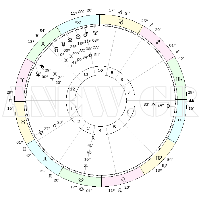| | ΘΕΣΕΙΣ ΠΛΑΝΗΤΩΝ ΑΣΤΡΟΛΟΓΙΚΟΥ ΧΑΡΤΗ ΤΗΣ ΣΤΙΓΜΗΣ ΑΥΤΗΣ | | | | Πλανήτης | Ζώδιο | Μοίρες | Δεκαήμ. | Σε οίκο | Απόκλιση | | Ακμές των οίκων | | Ηλιος | Υδροχόος | 18°30' | Δεύτερο | 12 | 15 S 17 | | 1ος | 18°48' | Ιχθείς | | Σελήνη | Ζυγός | 23°41' | Τρίτο | 7 | 12 S 37 | | 2ος | 01°34' | Ταύρος | | Ερμής | Ιχθείς | 00°36' | Πρώτο | 12 | 12 S 28 | | 3ος | 00°47' | Δίδυμοι | | Αφροδίτη | Υδροχόος | 26°04' | Τρίτο | 12 | 14 S 10 | | 4ος | 23°41' | Δίδυμοι | | Αρης | Υδροχόος | 11°40' | Δεύτερο | 12 | 18 S 18 | | 5ος | 15°35' | Καρκίνος | | Δίας | Καρκίνος | 16°42'R | Δεύτερο | 5 | 22 N 42 | | 6ος | 11°23' | Λέων | | Κρόνος | Ιχθείς | 29°24' | Τρίτο | 1 | 02 S 13 | | 7ος | 18°48' | Παρθένος | | Ουρανός | Ταύρος | 27°28' | Τρίτο | 2 | 19 N 24 | | 8ος | 01°34' | Σκορπιός | | Ποσειδώνας | Κριός | 00°20' | Πρώτο | 1 | 01 S 05 | | 9ος | 00°47' | Τοξότης | | Πλούτωνας | Υδροχόος | 03°54' | Πρώτο | 11 | 22 S 59 | | 10ος | 23°41' | Τοξότης | | Β. Δεσμός | Ιχθείς | 10°12' | Δεύτερο | 12 | 07 S 45 | | 11ος | 15°35' | Αιγόκερως | | Ωροσκόπος | Ιχθείς | 18°48' | Δεύτερο | | | 12ος | 11°23' | Υδροχόος | | Μεσουράνημα | Τοξότης | 23°41' | Τρίτο | | | |