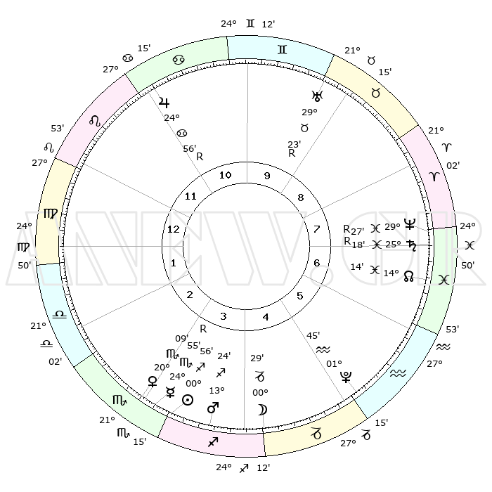 | | ΘΕΣΕΙΣ ΠΛΑΝΗΤΩΝ ΑΣΤΡΟΛΟΓΙΚΟΥ ΧΑΡΤΗ ΤΗΣ ΣΤΙΓΜΗΣ ΑΥΤΗΣ | | | | Πλανήτης | Ζώδιο | Μοίρες | Δεκαήμ. | Σε οίκο | Απόκλιση | | Ακμές των οίκων | | Ηλιος | Τοξότης | 00°53' | Πρώτο | 3 | 20 S 20 | | 1ος | 07°41' | Παρθένος | | Σελήνη | Τοξότης | 29°47' | Τρίτο | 4 | 28 S 16 | | 2ος | 02°20' | Ζυγός | | Ερμής | Σκορπιός | 24°59'R | Τρίτο | 3 | 17 S 42 | | 3ος | 01°38' | Σκορπιός | | Αφροδίτη | Σκορπιός | 20°04' | Τρίτο | 3 | 16 S 49 | | 4ος | 04°35' | Τοξότης | | Αρης | Τοξότης | 13°21' | Δεύτερο | 4 | 22 S 59 | | 5ος | 08°18' | Αιγόκερως | | Δίας | Καρκίνος | 24°56'R | Τρίτο | 11 | 21 N 16 | | 6ος | 09°43' | Υδροχόος | | Κρόνος | Ιχθείς | 25°18'R | Τρίτο | 7 | 04 S 04 | | 7ος | 07°41' | Ιχθείς | | Ουρανός | Ταύρος | 29°23'R | Τρίτο | 9 | 19 N 49 | | 8ος | 02°20' | Κριός | | Ποσειδώνας | Ιχθείς | 29°27'R | Τρίτο | 7 | 01 S 28 | | 9ος | 01°38' | Ταύρος | | Πλούτωνας | Υδροχόος | 01°45' | Πρώτο | 5 | 23 S 26 | | 10ος | 04°35' | Δίδυμοι | | Β. Δεσμός | Ιχθείς | 14°14' | Δεύτερο | 7 | 06 S 12 | | 11ος | 08°18' | Καρκίνος | | Ωροσκόπος | Παρθένος | 07°41' | Πρώτο | | | 12ος | 09°43' | Λέων | | Μεσουράνημα | Δίδυμοι | 04°35' | Πρώτο | | | |