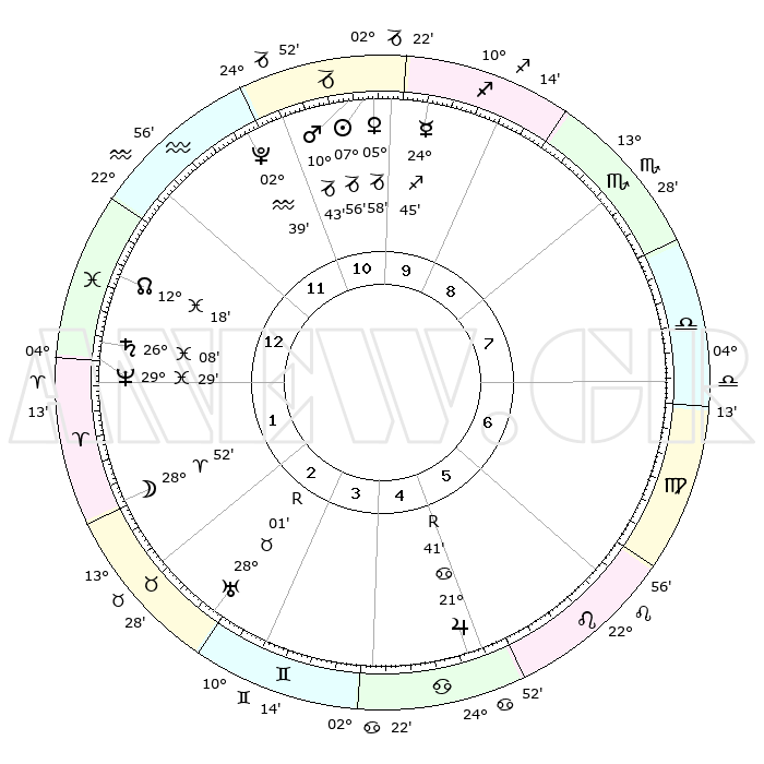 | | ΘΕΣΕΙΣ ΠΛΑΝΗΤΩΝ ΑΣΤΡΟΛΟΓΙΚΟΥ ΧΑΡΤΗ ΤΗΣ ΣΤΙΓΜΗΣ ΑΥΤΗΣ | | | | Πλανήτης | Ζώδιο | Μοίρες | Δεκαήμ. | Σε οίκο | Απόκλιση | | Ακμές των οίκων | | Ηλιος | Αιγόκερως | 07°52' | Πρώτο | 11 | 23 S 12 | | 1ος | 23°41' | Υδροχόος | | Σελήνη | Κριός | 27°51' | Τρίτο | 2 | 14 N 09 | | 2ος | 09°27' | Κριός | | Ερμής | Τοξότης | 24°38' | Τρίτο | 10 | 23 S 36 | | 3ος | 13°25' | Ταύρος | | Αφροδίτη | Αιγόκερως | 05°53' | Πρώτο | 11 | 23 S 42 | | 4ος | 08°30' | Δίδυμοι | | Αρης | Αιγόκερως | 10°40' | Δεύτερο | 11 | 23 S 53 | | 5ος | 00°14' | Καρκίνος | | Δίας | Καρκίνος | 21°42'R | Τρίτο | 5 | 21 N 55 | | 6ος | 23°11' | Καρκίνος | | Κρόνος | Ιχθείς | 26°08' | Τρίτο | 1 | 03 S 37 | | 7ος | 23°41' | Λέων | | Ουρανός | Ταύρος | 28°01'R | Τρίτο | 3 | 19 N 31 | | 8ος | 09°27' | Ζυγός | | Ποσειδώνας | Ιχθείς | 29°29' | Τρίτο | 1 | 01 S 26 | | 9ος | 13°25' | Σκορπιός | | Πλούτωνας | Υδροχόος | 02°39' | Πρώτο | 12 | 23 S 14 | | 10ος | 08°30' | Τοξότης | | Β. Δεσμός | Ιχθείς | 12°19' | Δεύτερο | 1 | 06 S 56 | | 11ος | 00°14' | Αιγόκερως | | Ωροσκόπος | Υδροχόος | 23°41' | Τρίτο | | | 12ος | 23°11' | Αιγόκερως | | Μεσουράνημα | Τοξότης | 08°30' | Πρώτο | | | |