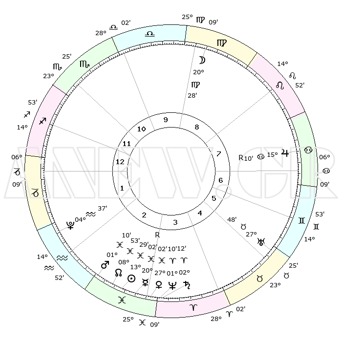 | | ΘΕΣΕΙΣ ΠΛΑΝΗΤΩΝ ΑΣΤΡΟΛΟΓΙΚΟΥ ΧΑΡΤΗ ΤΗΣ ΣΤΙΓΜΗΣ ΑΥΤΗΣ | | | | Πλανήτης | Ζώδιο | Μοίρες | Δεκαήμ. | Σε οίκο | Απόκλιση | | Ακμές των οίκων | | Ηλιος | Ιχθείς | 13°25' | Δεύτερο | 3 | 06 S 31 | | 1ος | 18°42' | Τοξότης | | Σελήνη | Παρθένος | 19°46' | Δεύτερο | 9 | 03 N 09 | | 2ος | 23°10' | Αιγόκερως | | Ερμής | Ιχθείς | 20°05'R | Τρίτο | 3 | 00 S 35 | | 3ος | 01°56' | Ιχθείς | | Αφροδίτη | Ιχθείς | 26°58' | Τρίτο | 3 | 02 S 24 | | 4ος | 07°20' | Κριός | | Αρης | Ιχθείς | 01°07' | Πρώτο | 2 | 12 S 06 | | 5ος | 05°31' | Ταύρος | | Δίας | Καρκίνος | 15°10'R | Δεύτερο | 7 | 22 N 55 | | 6ος | 28°17' | Ταύρος | | Κρόνος | Κριός | 02°12' | Πρώτο | 3 | 01 S 05 | | 7ος | 18°42' | Δίδυμοι | | Ουρανός | Ταύρος | 27°48' | Τρίτο | 5 | 19 N 29 | | 8ος | 23°10' | Καρκίνος | | Ποσειδώνας | Κριός | 01°09' | Πρώτο | 3 | 00 S 44 | | 9ος | 01°56' | Παρθένος | | Πλούτωνας | Υδροχόος | 04°37' | Πρώτο | 2 | 22 S 52 | | 10ος | 07°20' | Ζυγός | | Β. Δεσμός | Ιχθείς | 08°53' | Πρώτο | 3 | 08 S 14 | | 11ος | 05°31' | Σκορπιός | | Ωροσκόπος | Τοξότης | 18°42' | Δεύτερο | | | 12ος | 28°17' | Σκορπιός | | Μεσουράνημα | Ζυγός | 07°20' | Πρώτο | | | |