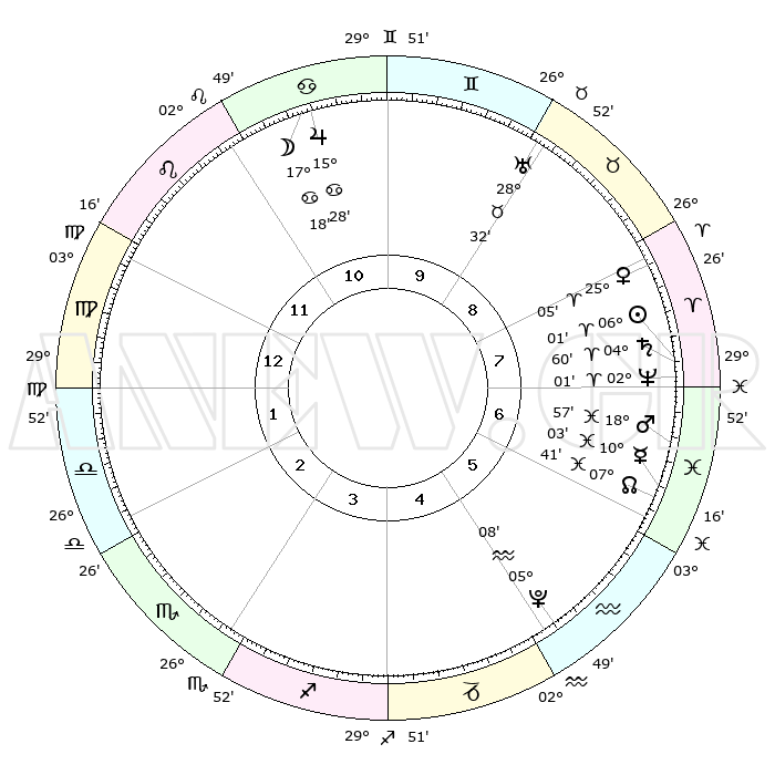 | | ΘΕΣΕΙΣ ΠΛΑΝΗΤΩΝ ΑΣΤΡΟΛΟΓΙΚΟΥ ΧΑΡΤΗ ΤΗΣ ΣΤΙΓΜΗΣ ΑΥΤΗΣ | | | | Πλανήτης | Ζώδιο | Μοίρες | Δεκαήμ. | Σε οίκο | Απόκλιση | | Ακμές των οίκων | | Ηλιος | Κριός | 05°56' | Πρώτο | 8 | 02 N 22 | | 1ος | 07°48' | Παρθένος | | Σελήνη | Καρκίνος | 16°16' | Δεύτερο | 11 | 26 N 34 | | 2ος | 02°27' | Ζυγός | | Ερμής | Ιχθείς | 10°01' | Δεύτερο | 7 | 08 S 07 | | 3ος | 01°45' | Σκορπιός | | Αφροδίτη | Κριός | 24°59' | Τρίτο | 8 | 09 N 04 | | 4ος | 04°43' | Τοξότης | | Αρης | Ιχθείς | 18°54' | Δεύτερο | 7 | 05 S 22 | | 5ος | 08°25' | Αιγόκερως | | Δίας | Καρκίνος | 15°28' | Δεύτερο | 11 | 22 N 54 | | 6ος | 09°50' | Υδροχόος | | Κρόνος | Κριός | 04°59' | Πρώτο | 8 | 00 N 02 | | 7ος | 07°48' | Ιχθείς | | Ουρανός | Ταύρος | 28°32' | Τρίτο | 9 | 19 N 40 | | 8ος | 02°27' | Κριός | | Ποσειδώνας | Κριός | 02°00' | Πρώτο | 7 | 00 S 24 | | 9ος | 01°45' | Ταύρος | | Πλούτωνας | Υδροχόος | 05°07' | Πρώτο | 5 | 22 S 48 | | 10ος | 04°43' | Δίδυμοι | | Β. Δεσμός | Ιχθείς | 07°41' | Πρώτο | 6 | 08 S 41 | | 11ος | 08°25' | Καρκίνος | | Ωροσκόπος | Παρθένος | 07°48' | Πρώτο | | | 12ος | 09°50' | Λέων | | Μεσουράνημα | Δίδυμοι | 04°43' | Πρώτο | | | |