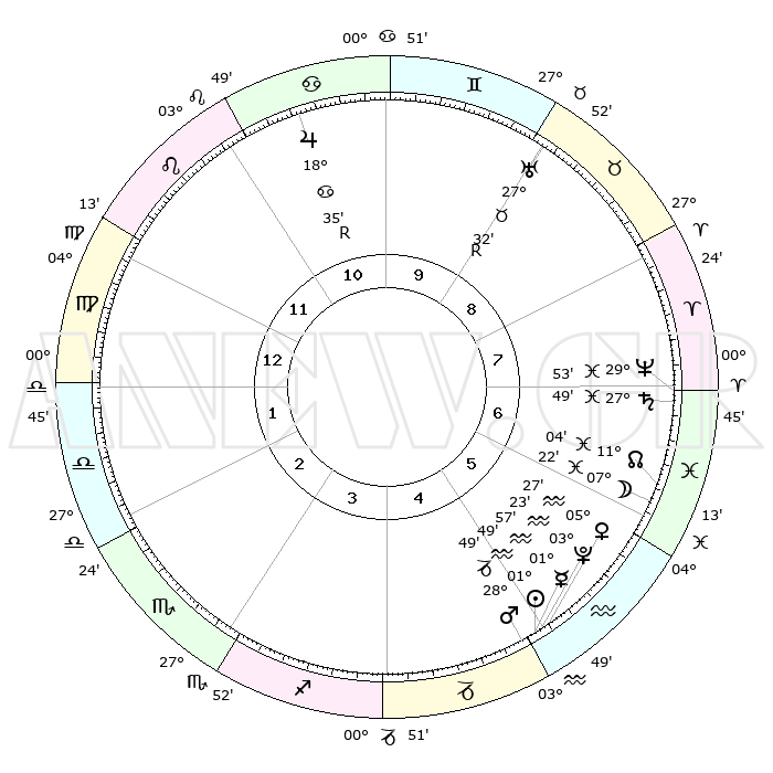 | | ΘΕΣΕΙΣ ΠΛΑΝΗΤΩΝ ΑΣΤΡΟΛΟΓΙΚΟΥ ΧΑΡΤΗ ΤΗΣ ΣΤΙΓΜΗΣ ΑΥΤΗΣ | | | | Πλανήτης | Ζώδιο | Μοίρες | Δεκαήμ. | Σε οίκο | Απόκλιση | | Ακμές των οίκων | | Ηλιος | Υδροχόος | 01°44' | Πρώτο | 5 | 19 S 46 | | 1ος | 08°41' | Παρθένος | | Σελήνη | Ιχθείς | 06°23' | Πρώτο | 6 | 09 S 25 | | 2ος | 03°26' | Ζυγός | | Ερμής | Υδροχόος | 01°49' | Πρώτο | 5 | 21 S 45 | | 3ος | 02°48' | Σκορπιός | | Αφροδίτη | Υδροχόος | 05°21' | Πρώτο | 5 | 20 S 03 | | 4ος | 05°45' | Τοξότης | | Αρης | Αιγόκερως | 28°45' | Τρίτο | 5 | 21 S 23 | | 5ος | 09°24' | Αιγόκερως | | Δίας | Καρκίνος | 18°35'R | Δεύτερο | 11 | 22 N 26 | | 6ος | 10°46' | Υδροχόος | | Κρόνος | Ιχθείς | 27°48' | Τρίτο | 7 | 02 S 53 | | 7ος | 08°41' | Ιχθείς | | Ουρανός | Ταύρος | 27°32'R | Τρίτο | 9 | 19 N 25 | | 8ος | 03°26' | Κριός | | Ποσειδώνας | Ιχθείς | 29°53' | Τρίτο | 7 | 01 S 15 | | 9ος | 02°48' | Ταύρος | | Πλούτωνας | Υδροχόος | 03°22' | Πρώτο | 5 | 23 S 05 | | 10ος | 05°45' | Δίδυμοι | | Β. Δεσμός | Ιχθείς | 11°04' | Δεύτερο | 7 | 07 S 25 | | 11ος | 09°24' | Καρκίνος | | Ωροσκόπος | Παρθένος | 08°41' | Πρώτο | | | 12ος | 10°47' | Λέων | | Μεσουράνημα | Δίδυμοι | 05°45' | Πρώτο | | | |