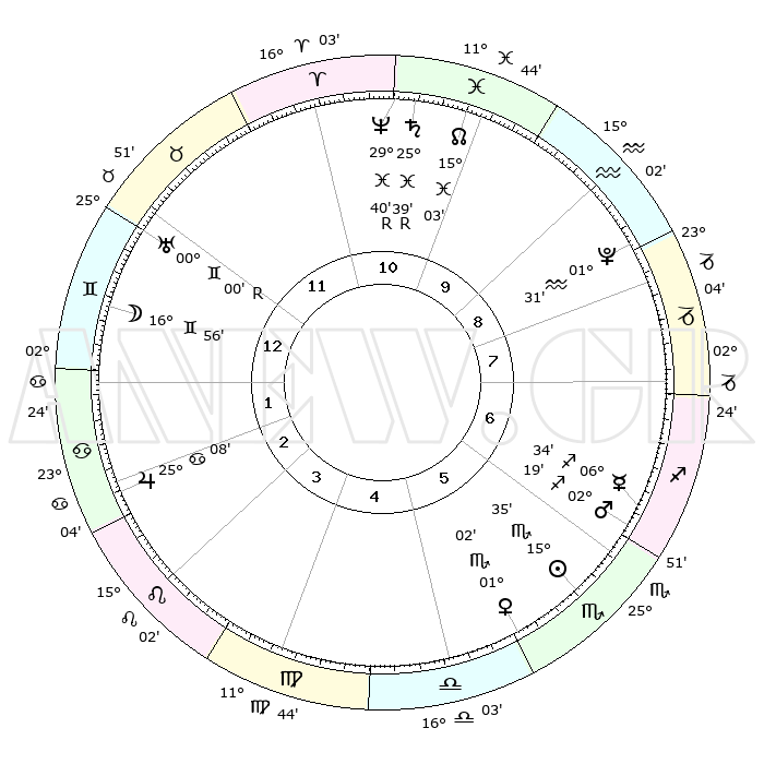 | | ΘΕΣΕΙΣ ΠΛΑΝΗΤΩΝ ΑΣΤΡΟΛΟΓΙΚΟΥ ΧΑΡΤΗ ΤΗΣ ΣΤΙΓΜΗΣ ΑΥΤΗΣ | | | | Πλανήτης | Ζώδιο | Μοίρες | Δεκαήμ. | Σε οίκο | Απόκλιση | | Ακμές των οίκων | | Ηλιος | Σκορπιός | 15°24' | Δεύτερο | 7 | 16 S 27 | | 1ος | 08°31' | Κριός | | Σελήνη | Δίδυμοι | 14°06' | Δεύτερο | 3 | 27 N 31 | | 2ος | 16°39' | Ταύρος | | Ερμής | Τοξότης | 06°31' | Πρώτο | 8 | 23 S 59 | | 3ος | 12°48' | Δίδυμοι | | Αφροδίτη | Σκορπιός | 00°48' | Πρώτο | 7 | 10 S 28 | | 4ος | 04°48' | Καρκίνος | | Αρης | Τοξότης | 02°11' | Πρώτο | 8 | 21 S 02 | | 5ος | 27°32' | Καρκίνος | | Δίας | Καρκίνος | 25°07' | Τρίτο | 4 | 21 N 12 | | 6ος | 26°18' | Λέων | | Κρόνος | Ιχθείς | 25°39'R | Τρίτο | 12 | 03 S 58 | | 7ος | 08°31' | Ζυγός | | Ουρανός | Δίδυμοι | 00°01'R | Πρώτο | 2 | 19 N 57 | | 8ος | 16°39' | Σκορπιός | | Ποσειδώνας | Ιχθείς | 29°40'R | Τρίτο | 12 | 01 S 23 | | 9ος | 12°48' | Τοξότης | | Πλούτωνας | Υδροχόος | 01°31' | Πρώτο | 11 | 23 S 30 | | 10ος | 04°48' | Αιγόκερως | | Β. Δεσμός | Ιχθείς | 15°03' | Δεύτερο | 12 | 05 S 53 | | 11ος | 27°32' | Αιγόκερως | | Ωροσκόπος | Κριός | 08°31' | Πρώτο | | | 12ος | 26°18' | Υδροχόος | | Μεσουράνημα | Αιγόκερως | 04°48' | Πρώτο | | | |