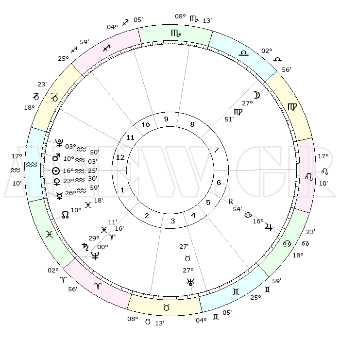 | | ΘΕΣΕΙΣ ΠΛΑΝΗΤΩΝ ΑΣΤΡΟΛΟΓΙΚΟΥ ΧΑΡΤΗ ΤΗΣ ΣΤΙΓΜΗΣ ΑΥΤΗΣ | | | | Πλανήτης | Ζώδιο | Μοίρες | Δεκαήμ. | Σε οίκο | Απόκλιση | | Ακμές των οίκων | | Ηλιος | Υδροχόος | 16°22' | Δεύτερο | 1 | 15 S 56 | | 1ος | 20°22' | Αιγόκερως | | Σελήνη | Παρθένος | 27°04' | Τρίτο | 8 | 00 S 19 | | 2ος | 02°34' | Ιχθείς | | Ερμής | Υδροχόος | 26°52' | Τρίτο | 1 | 14 S 00 | | 3ος | 12°16' | Κριός | | Αφροδίτη | Υδροχόος | 23°25' | Τρίτο | 1 | 15 S 03 | | 4ος | 12°29' | Ταύρος | | Αρης | Υδροχόος | 10°00' | Δεύτερο | 1 | 18 S 45 | | 5ος | 06°05' | Δίδυμοι | | Δίας | Καρκίνος | 16°55'R | Δεύτερο | 6 | 22 N 40 | | 6ος | 27°18' | Δίδυμοι | | Κρόνος | Ιχθείς | 29°11' | Τρίτο | 2 | 02 S 19 | | 7ος | 20°22' | Καρκίνος | | Ουρανός | Ταύρος | 27°27' | Τρίτο | 4 | 19 N 24 | | 8ος | 02°34' | Παρθένος | | Ποσειδώνας | Κριός | 00°16' | Πρώτο | 2 | 01 S 06 | | 9ος | 12°16' | Ζυγός | | Πλούτωνας | Υδροχόος | 03°50' | Πρώτο | 1 | 23 S 00 | | 10ος | 12°29' | Σκορπιός | | Β. Δεσμός | Ιχθείς | 10°18' | Δεύτερο | 2 | 07 S 42 | | 11ος | 06°05' | Τοξότης | | Ωροσκόπος | Αιγόκερως | 20°22' | Τρίτο | | | 12ος | 27°18' | Τοξότης | | Μεσουράνημα | Σκορπιός | 12°29' | Δεύτερο | | | |