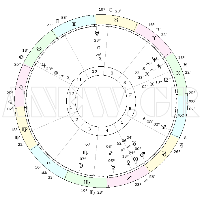 | | ΘΕΣΕΙΣ ΠΛΑΝΗΤΩΝ ΑΣΤΡΟΛΟΓΙΚΟΥ ΧΑΡΤΗ ΤΗΣ ΣΤΙΓΜΗΣ ΑΥΤΗΣ | | | | Πλανήτης | Ζώδιο | Μοίρες | Δεκαήμ. | Σε οίκο | Απόκλιση | | Ακμές των οίκων | | Ηλιος | Τοξότης | 23°02' | Τρίτο | 5 | 23 S 15 | | 1ος | 11°22' | Λέων | | Σελήνη | Ζυγός | 25°32' | Τρίτο | 3 | 13 S 02 | | 2ος | 03°20' | Παρθένος | | Ερμής | Τοξότης | 03°39' | Πρώτο | 4 | 19 S 20 | | 3ος | 29°54' | Παρθένος | | Αφροδίτη | Τοξότης | 17°33' | Δεύτερο | 5 | 22 S 41 | | 4ος | 02°05' | Σκορπιός | | Αρης | Τοξότης | 29°37' | Τρίτο | 5 | 24 S 12 | | 5ος | 07°36' | Τοξότης | | Δίας | Καρκίνος | 23°23'R | Τρίτο | 12 | 21 N 36 | | 6ος | 11°34' | Αιγόκερως | | Κρόνος | Ιχθείς | 25°32' | Τρίτο | 8 | 03 S 54 | | 7ος | 11°22' | Υδροχόος | | Ουρανός | Ταύρος | 28°30'R | Τρίτο | 10 | 19 N 37 | | 8ος | 03°20' | Ιχθείς | | Ποσειδώνας | Ιχθείς | 29°23' | Τρίτο | 8 | 01 S 29 | | 9ος | 29°54' | Ιχθείς | | Πλούτωνας | Υδροχόος | 02°14' | Πρώτο | 6 | 23 S 20 | | 10ος | 02°05' | Ταύρος | | Β. Δεσμός | Ιχθείς | 13°05' | Δεύτερο | 8 | 06 S 39 | | 11ος | 07°36' | Δίδυμοι | | Ωροσκόπος | Λέων | 11°22' | Δεύτερο | | | 12ος | 11°34' | Καρκίνος | | Μεσουράνημα | Ταύρος | 02°05' | Πρώτο | | | |