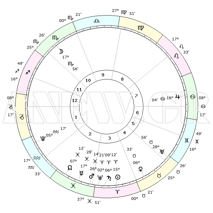 | | ΘΕΣΕΙΣ ΠΛΑΝΗΤΩΝ ΑΣΤΡΟΛΟΓΙΚΟΥ ΧΑΡΤΗ ΤΗΣ ΣΤΙΓΜΗΣ ΑΥΤΗΣ | | | | Πλανήτης | Ζώδιο | Μοίρες | Δεκαήμ. | Σε οίκο | Απόκλιση | | Ακμές των οίκων | | Ηλιος | Κριός | 15°01' | Δεύτερο | 5 | 05 N 55 | | 1ος | 12°24' | Σκορπιός | | Σελήνη | Σκορπιός | 15°43' | Δεύτερο | 1 | 21 S 06 | | 2ος | 11°39' | Τοξότης | | Ερμής | Ιχθείς | 17°16' | Δεύτερο | 4 | 06 S 43 | | 3ος | 14°49' | Αιγόκερως | | Αφροδίτη | Ταύρος | 06°19' | Πρώτο | 6 | 13 N 21 | | 4ος | 19°55' | Υδροχόος | | Αρης | Ιχθείς | 26°06' | Τρίτο | 5 | 02 S 30 | | 5ος | 22°28' | Ιχθείς | | Δίας | Καρκίνος | 16°03' | Δεύτερο | 9 | 22 N 50 | | 6ος | 19°50' | Κριός | | Κρόνος | Κριός | 06°08' | Πρώτο | 5 | 00 N 29 | | 7ος | 12°24' | Ταύρος | | Ουρανός | Ταύρος | 28°56' | Τρίτο | 7 | 19 N 45 | | 8ος | 11°39' | Δίδυμοι | | Ποσειδώνας | Κριός | 02°21' | Πρώτο | 5 | 00 S 16 | | 9ος | 14°49' | Καρκίνος | | Πλούτωνας | Υδροχόος | 05°16' | Πρώτο | 3 | 22 S 47 | | 10ος | 19°55' | Λέων | | Β. Δεσμός | Ιχθείς | 07°12' | Πρώτο | 4 | 08 S 52 | | 11ος | 22°28' | Παρθένος | | Ωροσκόπος | Σκορπιός | 12°24' | Δεύτερο | | | 12ος | 19°50' | Ζυγός | | Μεσουράνημα | Λέων | 19°55' | Δεύτερο | | | |
