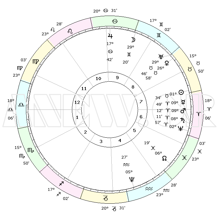 | | ΘΕΣΕΙΣ ΠΛΑΝΗΤΩΝ ΑΣΤΡΟΛΟΓΙΚΟΥ ΧΑΡΤΗ ΤΗΣ ΣΤΙΓΜΗΣ ΑΥΤΗΣ | | | | Πλανήτης | Ζώδιο | Μοίρες | Δεκαήμ. | Σε οίκο | Απόκλιση | | Ακμές των οίκων | | Ηλιος | Ταύρος | 01°30' | Πρώτο | 8 | 12 N 00 | | 1ος | 29°05' | Παρθένος | | Σελήνη | Δίδυμοι | 28°23' | Τρίτο | 9 | 28 N 11 | | 2ος | 25°37' | Ζυγός | | Ερμής | Κριός | 09°43' | Πρώτο | 7 | 01 N 28 | | 3ος | 26°00' | Σκορπιός | | Αφροδίτη | Ταύρος | 26°53' | Τρίτο | 9 | 19 N 55 | | 4ος | 28°59' | Τοξότης | | Αρης | Κριός | 09°09' | Πρώτο | 7 | 02 N 45 | | 5ος | 01°58' | Υδροχόος | | Δίας | Καρκίνος | 17°42' | Δεύτερο | 10 | 22 N 39 | | 6ος | 02°26' | Ιχθείς | | Κρόνος | Κριός | 08°10' | Πρώτο | 7 | 01 N 16 | | 7ος | 29°05' | Ιχθείς | | Ουρανός | Ταύρος | 29°46' | Τρίτο | 9 | 19 N 56 | | 8ος | 25°37' | Κριός | | Ποσειδώνας | Κριός | 02°57' | Πρώτο | 7 | 00 S 02 | | 9ος | 26°00' | Ταύρος | | Πλούτωνας | Υδροχόος | 05°27' | Πρώτο | 5 | 22 S 48 | | 10ος | 28°58' | Δίδυμοι | | Β. Δεσμός | Ιχθείς | 06°19' | Πρώτο | 6 | 09 S 12 | | 11ος | 01°58' | Λέων | | Ωροσκόπος | Παρθένος | 29°05' | Τρίτο | | | 12ος | 02°26' | Παρθένος | | Μεσουράνημα | Δίδυμοι | 28°58' | Τρίτο | | | |