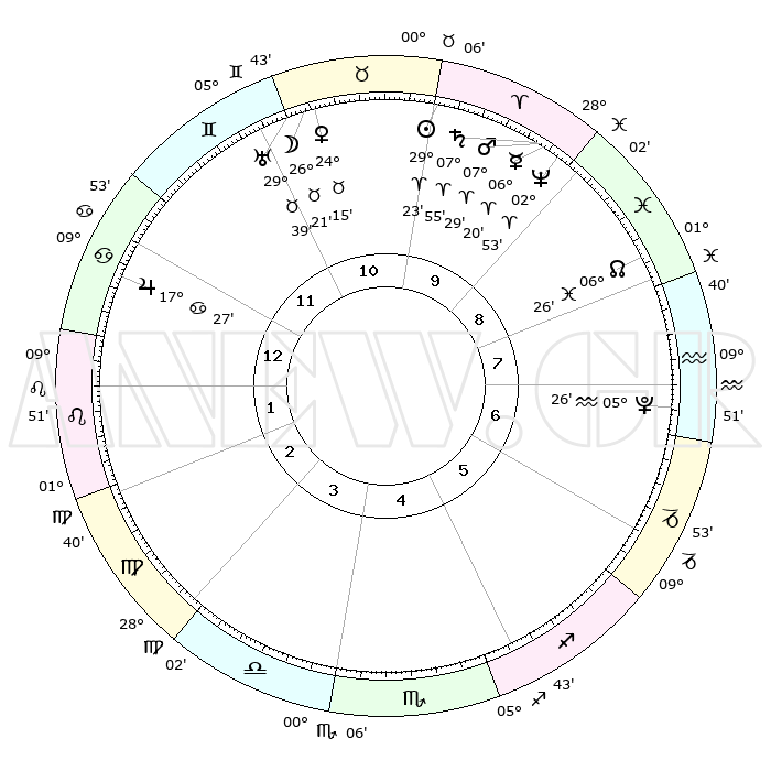 | | ΘΕΣΕΙΣ ΠΛΑΝΗΤΩΝ ΑΣΤΡΟΛΟΓΙΚΟΥ ΧΑΡΤΗ ΤΗΣ ΣΤΙΓΜΗΣ ΑΥΤΗΣ | | | | Πλανήτης | Ζώδιο | Μοίρες | Δεκαήμ. | Σε οίκο | Απόκλιση | | Ακμές των οίκων | | Ηλιος | Κριός | 29°20' | Τρίτο | 10 | 11 N 14 | | 1ος | 23°12' | Καρκίνος | | Σελήνη | Ταύρος | 25°30' | Τρίτο | 11 | 23 N 58 | | 2ος | 13°51' | Λέων | | Ερμής | Κριός | 06°15' | Πρώτο | 9 | 00 N 04 | | 3ος | 08°00' | Παρθένος | | Αφροδίτη | Ταύρος | 24°11' | Τρίτο | 11 | 19 N 10 | | 4ος | 08°06' | Ζυγός | | Αρης | Κριός | 07°26' | Πρώτο | 9 | 02 N 04 | | 5ος | 14°11' | Σκορπιός | | Δίας | Καρκίνος | 17°26' | Δεύτερο | 12 | 22 N 41 | | 6ος | 21°02' | Τοξότης | | Κρόνος | Κριός | 07°55' | Πρώτο | 9 | 01 N 10 | | 7ος | 23°12' | Αιγόκερως | | Ουρανός | Ταύρος | 29°39' | Τρίτο | 11 | 19 N 54 | | 8ος | 13°51' | Υδροχόος | | Ποσειδώνας | Κριός | 02°53' | Πρώτο | 9 | 00 S 04 | | 9ος | 08°00' | Ιχθείς | | Πλούτωνας | Υδροχόος | 05°26' | Πρώτο | 7 | 22 S 48 | | 10ος | 08°06' | Κριός | | Β. Δεσμός | Ιχθείς | 06°26' | Πρώτο | 8 | 09 S 09 | | 11ος | 14°11' | Ταύρος | | Ωροσκόπος | Καρκίνος | 23°12' | Τρίτο | | | 12ος | 21°02' | Δίδυμοι | | Μεσουράνημα | Κριός | 08°06' | Πρώτο | | | |