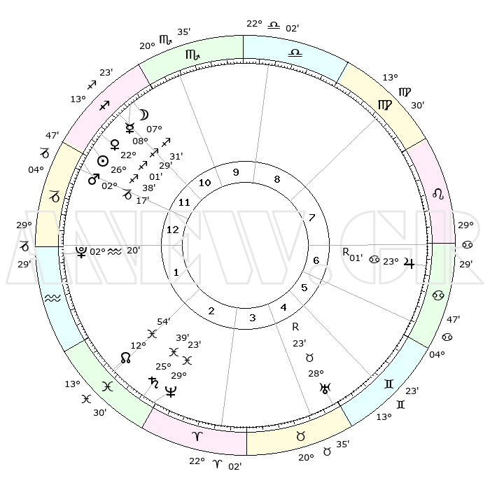 | | ΘΕΣΕΙΣ ΠΛΑΝΗΤΩΝ ΑΣΤΡΟΛΟΓΙΚΟΥ ΧΑΡΤΗ ΤΗΣ ΣΤΙΓΜΗΣ ΑΥΤΗΣ | | | | Πλανήτης | Ζώδιο | Μοίρες | Δεκαήμ. | Σε οίκο | Απόκλιση | | Ακμές των οίκων | | Ηλιος | Τοξότης | 26°19' | Τρίτο | 3 | 23 S 23 | | 1ος | 16°59' | Ζυγός | | Σελήνη | Τοξότης | 03°39' | Πρώτο | 2 | 25 S 44 | | 2ος | 14°39' | Σκορπιός | | Ερμής | Τοξότης | 08°02' | Πρώτο | 2 | 20 S 30 | | 3ος | 15°47' | Τοξότης | | Αφροδίτη | Τοξότης | 21°36' | Τρίτο | 3 | 23 S 07 | | 4ος | 19°14' | Αιγόκερως | | Αρης | Αιγόκερως | 02°02' | Πρώτο | 3 | 24 S 13 | | 5ος | 22°11' | Υδροχόος | | Δίας | Καρκίνος | 23°03'R | Τρίτο | 10 | 21 N 40 | | 6ος | 21°49' | Ιχθείς | | Κρόνος | Ιχθείς | 25°38' | Τρίτο | 6 | 03 S 51 | | 7ος | 16°59' | Κριός | | Ουρανός | Ταύρος | 28°23'R | Τρίτο | 8 | 19 N 36 | | 8ος | 14°39' | Ταύρος | | Ποσειδώνας | Ιχθείς | 29°23' | Τρίτο | 6 | 01 S 28 | | 9ος | 15°47' | Δίδυμοι | | Πλούτωνας | Υδροχόος | 02°19' | Πρώτο | 4 | 23 S 18 | | 10ος | 19°14' | Καρκίνος | | Β. Δεσμός | Ιχθείς | 12°55' | Δεύτερο | 5 | 06 S 43 | | 11ος | 22°11' | Λέων | | Ωροσκόπος | Ζυγός | 16°59' | Δεύτερο | | | 12ος | 21°49' | Παρθένος | | Μεσουράνημα | Καρκίνος | 19°14' | Δεύτερο | | | |