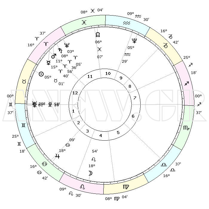 | | ΘΕΣΕΙΣ ΠΛΑΝΗΤΩΝ ΑΣΤΡΟΛΟΓΙΚΟΥ ΧΑΡΤΗ ΤΗΣ ΣΤΙΓΜΗΣ ΑΥΤΗΣ | | | | Πλανήτης | Ζώδιο | Μοίρες | Δεκαήμ. | Σε οίκο | Απόκλιση | | Ακμές των οίκων | | Ηλιος | Ταύρος | 04°54' | Πρώτο | 1 | 13 N 09 | | 1ος | 26°51' | Ιχθείς | | Σελήνη | Λέων | 17°16' | Δεύτερο | 5 | 17 N 19 | | 2ος | 07°53' | Ταύρος | | Ερμής | Κριός | 15°27' | Δεύτερο | 1 | 03 N 51 | | 3ος | 05°47' | Δίδυμοι | | Αφροδίτη | Δίδυμοι | 01°08' | Πρώτο | 2 | 21 N 00 | | 4ος | 28°14' | Δίδυμοι | | Αρης | Κριός | 11°50' | Δεύτερο | 1 | 03 N 50 | | 5ος | 20°24' | Καρκίνος | | Δίας | Καρκίνος | 18°08' | Δεύτερο | 4 | 22 N 35 | | 6ος | 17°20' | Λέων | | Κρόνος | Κριός | 08°35' | Πρώτο | 1 | 01 N 25 | | 7ος | 26°51' | Παρθένος | | Ουρανός | Ταύρος | 29°57' | Τρίτο | 2 | 19 N 58 | | 8ος | 07°53' | Σκορπιός | | Ποσειδώνας | Κριός | 03°04' | Πρώτο | 1 | 00 N 01 | | 9ος | 05°47' | Τοξότης | | Πλούτωνας | Υδροχόος | 05°29' | Πρώτο | 11 | 22 S 48 | | 10ος | 28°14' | Τοξότης | | Β. Δεσμός | Ιχθείς | 06°08' | Πρώτο | 12 | 09 S 16 | | 11ος | 20°24' | Αιγόκερως | | Ωροσκόπος | Ιχθείς | 26°51' | Τρίτο | | | 12ος | 17°20' | Υδροχόος | | Μεσουράνημα | Τοξότης | 28°14' | Τρίτο | | | |
