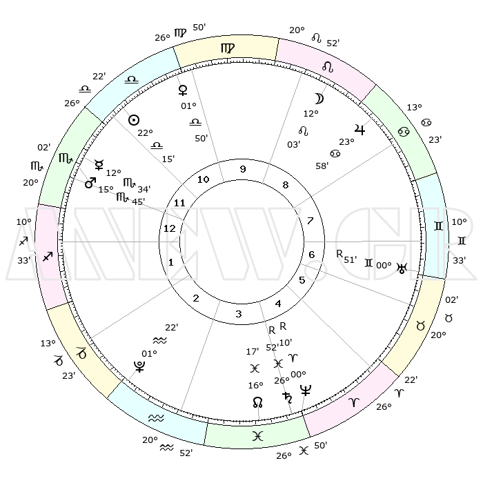 | ΘΕΣΕΙΣ ΠΛΑΝΗΤΩΝ ΑΣΤΡΟΛΟΓΙΚΟΥ ΧΑΡΤΗ ΤΗΣ ΣΤΙΓΜΗΣ ΑΥΤΗΣ | | Πλανήτης | Ζώδιο | Μοίρες | Δεκαήμ. | Σε οίκο | Απόκλιση | | Ακμές των οίκων | Ηλιος | Ζυγός | 21°59' | Τρίτο | 2 | 08 S 34 | | 1ος | 21°42' | Παρθένος | Σελήνη | Λέων | 08°31' | Πρώτο | 11 | 21 N 20 | | 2ος | 17°38' | Ζυγός | Ερμής | Σκορπιός | 12°12' | Δεύτερο | 2 | 17 S 09 | | 3ος | 17°43' | Σκορπιός | Αφροδίτη | Ζυγός | 01°30' | Πρώτο | 1 | 00 N 47 | | 4ος | 20°39' | Τοξότης | Αρης | Σκορπιός | 15°34' | Δεύτερο | 2 | 16 S 43 | | 5ος | 23°47' | Αιγόκερως | Δίας | Καρκίνος | 23°56' | Τρίτο | 11 | 21 N 22 | | 6ος | 24°33' | Υδροχόος | Κρόνος | Ιχθείς | 26°53'R | Τρίτο | 7 | 03 S 32 | | 7ος | 21°42' | Ιχθείς | Ουρανός | Δίδυμοι | 00°51'R | Πρώτο | 9 | 20 N 07 | | 8ος | 17°38' | Κριός | Ποσειδώνας | Κριός | 00°10'R | Πρώτο | 7 | 01 S 11 | | 9ος | 17°43' | Ταύρος | Πλούτωνας | Υδροχόος | 01°22' | Πρώτο | 5 | 23 S 32 | | 10ος | 20°39' | Δίδυμοι | Β. Δεσμός | Ιχθείς | 16°18' | Δεύτερο | 6 | 05 S 24 | | 11ος | 23°47' | Καρκίνος | Ωροσκόπος | Παρθένος | 21°42' | Τρίτο | | | 12ος | 24°33' | Λέων | Μεσουράνημα | Δίδυμοι | 20°39' | Τρίτο | | | |