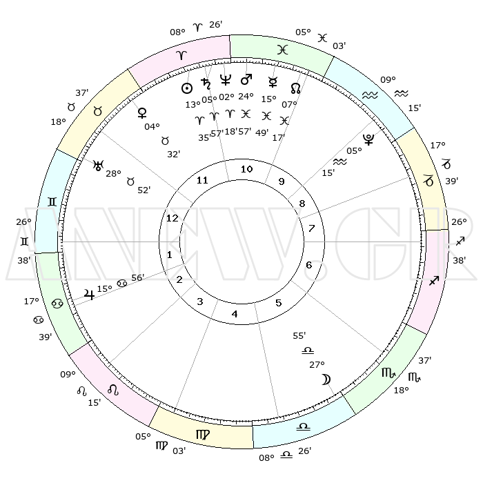 | | ΘΕΣΕΙΣ ΠΛΑΝΗΤΩΝ ΑΣΤΡΟΛΟΓΙΚΟΥ ΧΑΡΤΗ ΤΗΣ ΣΤΙΓΜΗΣ ΑΥΤΗΣ | | | | Πλανήτης | Ζώδιο | Μοίρες | Δεκαήμ. | Σε οίκο | Απόκλιση | | Ακμές των οίκων | | Ηλιος | Κριός | 13°32' | Δεύτερο | 11 | 05 N 20 | | 1ος | 02°48' | Δίδυμοι | | Σελήνη | Ζυγός | 27°07' | Τρίτο | 6 | 14 S 04 | | 2ος | 27°03' | Δίδυμοι | | Ερμής | Ιχθείς | 15°45' | Δεύτερο | 11 | 07 S 07 | | 3ος | 18°23' | Καρκίνος | | Αφροδίτη | Ταύρος | 04°27' | Πρώτο | 12 | 12 N 40 | | 4ος | 11°22' | Λέων | | Αρης | Ιχθείς | 24°54' | Τρίτο | 11 | 02 S 59 | | 5ος | 10°19' | Παρθένος | | Δίας | Καρκίνος | 15°56' | Δεύτερο | 2 | 22 N 51 | | 6ος | 19°11' | Ζυγός | | Κρόνος | Κριός | 05°57' | Πρώτο | 11 | 00 N 24 | | 7ος | 02°48' | Τοξότης | | Ουρανός | Ταύρος | 28°52' | Τρίτο | 12 | 19 N 44 | | 8ος | 27°03' | Τοξότης | | Ποσειδώνας | Κριός | 02°18' | Πρώτο | 11 | 00 S 17 | | 9ος | 18°23' | Αιγόκερως | | Πλούτωνας | Υδροχόος | 05°15' | Πρώτο | 9 | 22 S 47 | | 10ος | 11°22' | Υδροχόος | | Β. Δεσμός | Ιχθείς | 07°17' | Πρώτο | 10 | 08 S 50 | | 11ος | 10°19' | Ιχθείς | | Ωροσκόπος | Δίδυμοι | 02°48' | Πρώτο | | | 12ος | 19°11' | Κριός | | Μεσουράνημα | Υδροχόος | 11°22' | Δεύτερο | | | |