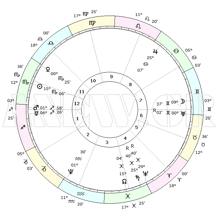 | | ΘΕΣΕΙΣ ΠΛΑΝΗΤΩΝ ΑΣΤΡΟΛΟΓΙΚΟΥ ΧΑΡΤΗ ΤΗΣ ΣΤΙΓΜΗΣ ΑΥΤΗΣ | | | | Πλανήτης | Ζώδιο | Μοίρες | Δεκαήμ. | Σε οίκο | Απόκλιση | | Ακμές των οίκων | | Ηλιος | Σκορπιός | 15°01' | Δεύτερο | 1 | 16 S 20 | | 1ος | 09°13' | Σκορπιός | | Σελήνη | Δίδυμοι | 08°21' | Πρώτο | 8 | 26 N 39 | | 2ος | 08°14' | Τοξότης | | Ερμής | Τοξότης | 06°24' | Πρώτο | 1 | 24 S 00 | | 3ος | 11°02' | Αιγόκερως | | Αφροδίτη | Σκορπιός | 00°19' | Πρώτο | 12 | 10 S 17 | | 4ος | 15°53' | Υδροχόος | | Αρης | Τοξότης | 01°54' | Πρώτο | 1 | 20 S 59 | | 5ος | 18°35' | Ιχθείς | | Δίας | Καρκίνος | 25°07' | Τρίτο | 9 | 21 N 12 | | 6ος | 16°19' | Κριός | | Κρόνος | Ιχθείς | 25°40'R | Τρίτο | 5 | 03 S 58 | | 7ος | 09°13' | Ταύρος | | Ουρανός | Δίδυμοι | 00°02'R | Πρώτο | 7 | 19 N 57 | | 8ος | 08°14' | Δίδυμοι | | Ποσειδώνας | Ιχθείς | 29°40'R | Τρίτο | 5 | 01 S 23 | | 9ος | 11°02' | Καρκίνος | | Πλούτωνας | Υδροχόος | 01°30' | Πρώτο | 3 | 23 S 30 | | 10ος | 15°53' | Λέων | | Β. Δεσμός | Ιχθείς | 15°04' | Δεύτερο | 4 | 05 S 53 | | 11ος | 18°35' | Παρθένος | | Ωροσκόπος | Σκορπιός | 09°13' | Πρώτο | | | 12ος | 16°19' | Ζυγός | | Μεσουράνημα | Λέων | 15°53' | Δεύτερο | | | |