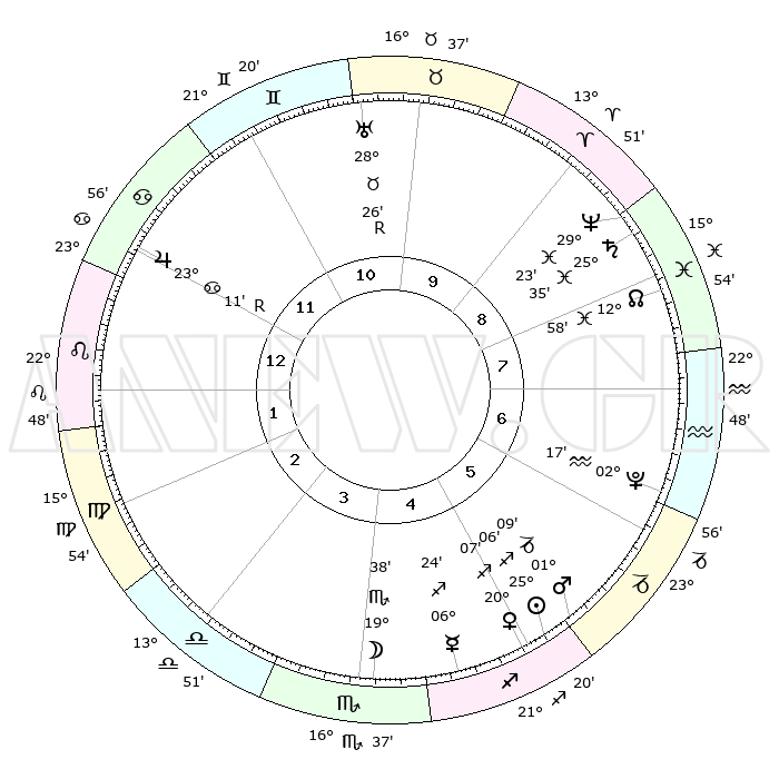 | | ΘΕΣΕΙΣ ΠΛΑΝΗΤΩΝ ΑΣΤΡΟΛΟΓΙΚΟΥ ΧΑΡΤΗ ΤΗΣ ΣΤΙΓΜΗΣ ΑΥΤΗΣ | | | | Πλανήτης | Ζώδιο | Μοίρες | Δεκαήμ. | Σε οίκο | Απόκλιση | | Ακμές των οίκων | | Ηλιος | Τοξότης | 24°45' | Τρίτο | 9 | 23 S 20 | | 1ος | 11°54' | Κριός | | Σελήνη | Σκορπιός | 15°29' | Δεύτερο | 7 | 20 S 44 | | 2ος | 19°08' | Ταύρος | | Ερμής | Τοξότης | 05°55' | Πρώτο | 8 | 19 S 57 | | 3ος | 14°49' | Δίδυμοι | | Αφροδίτη | Τοξότης | 19°40' | Δεύτερο | 9 | 22 S 56 | | 4ος | 06°43' | Καρκίνος | | Αρης | Αιγόκερως | 00°53' | Πρώτο | 9 | 24 S 13 | | 5ος | 29°39' | Καρκίνος | | Δίας | Καρκίνος | 23°13'R | Τρίτο | 4 | 21 N 38 | | 6ος | 29°00' | Λέων | | Κρόνος | Ιχθείς | 25°35' | Τρίτο | 12 | 03 S 53 | | 7ος | 11°54' | Ζυγός | | Ουρανός | Ταύρος | 28°27'R | Τρίτο | 2 | 19 N 37 | | 8ος | 19°08' | Σκορπιός | | Ποσειδώνας | Ιχθείς | 29°23' | Τρίτο | 12 | 01 S 29 | | 9ος | 14°49' | Τοξότης | | Πλούτωνας | Υδροχόος | 02°17' | Πρώτο | 11 | 23 S 19 | | 10ος | 06°43' | Αιγόκερως | | Β. Δεσμός | Ιχθείς | 12°60' | Δεύτερο | 12 | 06 S 41 | | 11ος | 29°39' | Αιγόκερως | | Ωροσκόπος | Κριός | 11°54' | Δεύτερο | | | 12ος | 29°00' | Υδροχόος | | Μεσουράνημα | Αιγόκερως | 06°43' | Πρώτο | | | |