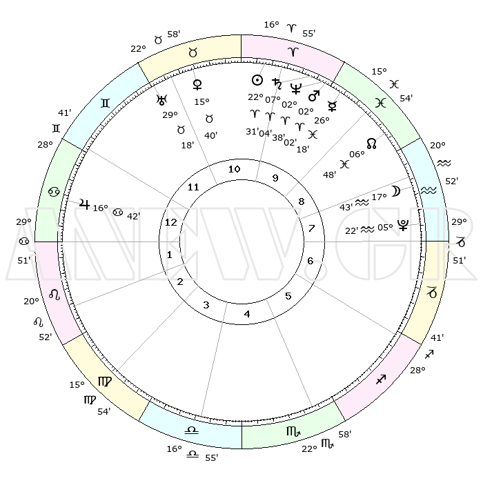 | | ΘΕΣΕΙΣ ΠΛΑΝΗΤΩΝ ΑΣΤΡΟΛΟΓΙΚΟΥ ΧΑΡΤΗ ΤΗΣ ΣΤΙΓΜΗΣ ΑΥΤΗΣ | | | | Πλανήτης | Ζώδιο | Μοίρες | Δεκαήμ. | Σε οίκο | Απόκλιση | | Ακμές των οίκων | | Ηλιος | Κριός | 22°28' | Τρίτο | 10 | 08 N 44 | | 1ος | 11°57' | Καρκίνος | | Σελήνη | Υδροχόος | 16°58' | Δεύτερο | 8 | 17 S 32 | | 2ος | 02°23' | Λέων | | Ερμής | Ιχθείς | 26°13' | Τρίτο | 10 | 03 S 47 | | 3ος | 25°12' | Λέων | | Αφροδίτη | Ταύρος | 15°36' | Δεύτερο | 11 | 16 N 33 | | 4ος | 23°30' | Παρθένος | | Αρης | Κριός | 01°59' | Πρώτο | 10 | 00 S 07 | | 5ος | 28°58' | Ζυγός | | Δίας | Καρκίνος | 16°42' | Δεύτερο | 1 | 22 N 46 | | 6ος | 07°38' | Τοξότης | | Κρόνος | Κριός | 07°04' | Πρώτο | 10 | 00 N 50 | | 7ος | 11°57' | Αιγόκερως | | Ουρανός | Ταύρος | 29°18' | Τρίτο | 11 | 19 N 50 | | 8ος | 02°23' | Υδροχόος | | Ποσειδώνας | Κριός | 02°38' | Πρώτο | 10 | 00 S 09 | | 9ος | 25°12' | Υδροχόος | | Πλούτωνας | Υδροχόος | 05°22' | Πρώτο | 8 | 22 S 47 | | 10ος | 23°30' | Ιχθείς | | Β. Δεσμός | Ιχθείς | 06°48' | Πρώτο | 9 | 09 S 01 | | 11ος | 28°58' | Κριός | | Ωροσκόπος | Καρκίνος | 11°57' | Δεύτερο | | | 12ος | 07°38' | Δίδυμοι | | Μεσουράνημα | Ιχθείς | 23°30' | Τρίτο | | | |
