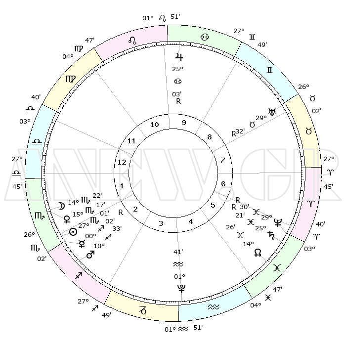 | | ΘΕΣΕΙΣ ΠΛΑΝΗΤΩΝ ΑΣΤΡΟΛΟΓΙΚΟΥ ΧΑΡΤΗ ΤΗΣ ΣΤΙΓΜΗΣ ΑΥΤΗΣ | | | | Πλανήτης | Ζώδιο | Μοίρες | Δεκαήμ. | Σε οίκο | Απόκλιση | | Ακμές των οίκων | | Ηλιος | Σκορπιός | 26°58' | Τρίτο | 2 | 19 S 29 | | 1ος | 13°06' | Ζυγός | | Σελήνη | Σκορπιός | 13°47' | Δεύτερο | 2 | 20 S 02 | | 2ος | 10°33' | Σκορπιός | | Ερμής | Τοξότης | 00°06'R | Πρώτο | 2 | 20 S 05 | | 3ος | 11°30' | Τοξότης | | Αφροδίτη | Σκορπιός | 15°13' | Δεύτερο | 2 | 15 S 21 | | 4ος | 14°47' | Αιγόκερως | | Αρης | Τοξότης | 10°31' | Δεύτερο | 2 | 22 S 34 | | 5ος | 17°44' | Υδροχόος | | Δίας | Καρκίνος | 25°04'R | Τρίτο | 10 | 21 N 14 | | 6ος | 17°35' | Ιχθείς | | Κρόνος | Ιχθείς | 25°21'R | Τρίτο | 6 | 04 S 03 | | 7ος | 13°06' | Κριός | | Ουρανός | Ταύρος | 29°33'R | Τρίτο | 8 | 19 N 51 | | 8ος | 10°33' | Ταύρος | | Ποσειδώνας | Ιχθείς | 29°30'R | Τρίτο | 6 | 01 S 27 | | 9ος | 11°30' | Δίδυμοι | | Πλούτωνας | Υδροχόος | 01°41' | Πρώτο | 4 | 23 S 27 | | 10ος | 14°47' | Καρκίνος | | Β. Δεσμός | Ιχθείς | 14°27' | Δεύτερο | 5 | 06 S 07 | | 11ος | 17°43' | Λέων | | Ωροσκόπος | Ζυγός | 13°06' | Δεύτερο | | | 12ος | 17°35' | Παρθένος | | Μεσουράνημα | Καρκίνος | 14°47' | Δεύτερο | | | |