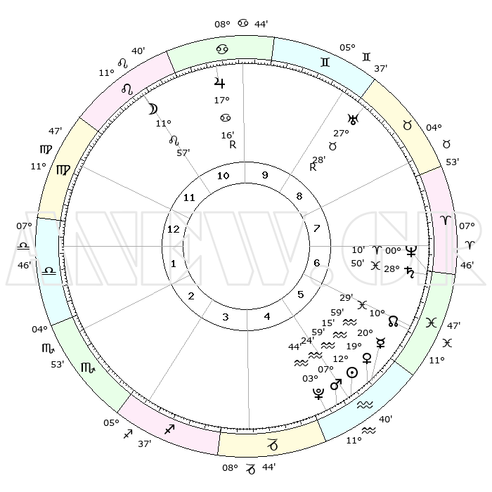 | | ΘΕΣΕΙΣ ΠΛΑΝΗΤΩΝ ΑΣΤΡΟΛΟΓΙΚΟΥ ΧΑΡΤΗ ΤΗΣ ΣΤΙΓΜΗΣ ΑΥΤΗΣ | | | | Πλανήτης | Ζώδιο | Μοίρες | Δεκαήμ. | Σε οίκο | Απόκλιση | | Ακμές των οίκων | | Ηλιος | Υδροχόος | 12°56' | Δεύτερο | 5 | 16 S 56 | | 1ος | 20°34' | Παρθένος | | Σελήνη | Λέων | 11°07' | Δεύτερο | 11 | 19 N 47 | | 2ος | 16°25' | Ζυγός | | Ερμής | Υδροχόος | 20°53' | Τρίτο | 5 | 16 S 16 | | 3ος | 16°27' | Σκορπιός | | Αφροδίτη | Υδροχόος | 19°10' | Δεύτερο | 5 | 16 S 22 | | 4ος | 19°23' | Τοξότης | | Αρης | Υδροχόος | 07°21' | Πρώτο | 5 | 19 S 26 | | 5ος | 22°33' | Αιγόκερως | | Δίας | Καρκίνος | 17°16'R | Δεύτερο | 10 | 22 N 37 | | 6ος | 23°21' | Υδροχόος | | Κρόνος | Ιχθείς | 28°50' | Τρίτο | 7 | 02 S 27 | | 7ος | 20°34' | Ιχθείς | | Ουρανός | Ταύρος | 27°28'R | Τρίτο | 9 | 19 N 24 | | 8ος | 16°25' | Κριός | | Ποσειδώνας | Κριός | 00°10' | Πρώτο | 7 | 01 S 08 | | 9ος | 16°27' | Ταύρος | | Πλούτωνας | Υδροχόος | 03°44' | Πρώτο | 5 | 23 S 01 | | 10ος | 19°23' | Δίδυμοι | | Β. Δεσμός | Ιχθείς | 10°29' | Δεύτερο | 6 | 07 S 38 | | 11ος | 22°33' | Καρκίνος | | Ωροσκόπος | Παρθένος | 20°34' | Τρίτο | | | 12ος | 23°21' | Λέων | | Μεσουράνημα | Δίδυμοι | 19°23' | Δεύτερο | | | |