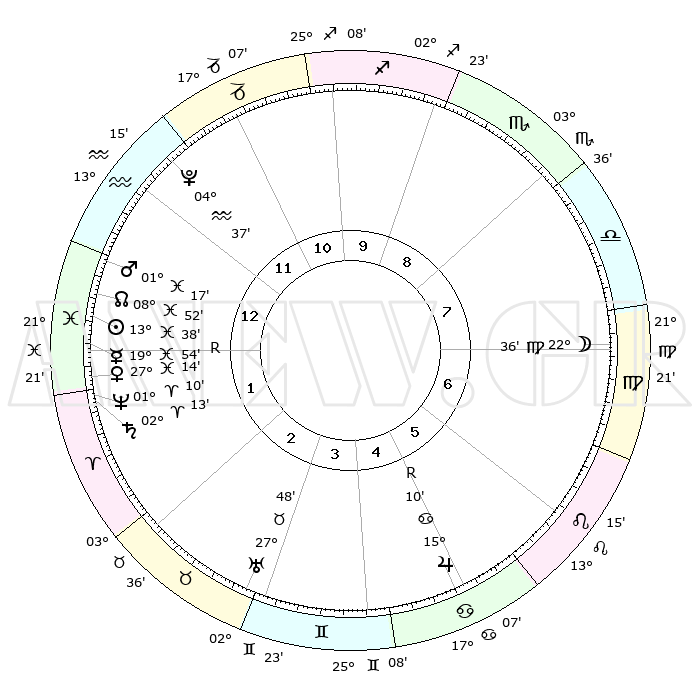 | | ΘΕΣΕΙΣ ΠΛΑΝΗΤΩΝ ΑΣΤΡΟΛΟΓΙΚΟΥ ΧΑΡΤΗ ΤΗΣ ΣΤΙΓΜΗΣ ΑΥΤΗΣ | | | | Πλανήτης | Ζώδιο | Μοίρες | Δεκαήμ. | Σε οίκο | Απόκλιση | | Ακμές των οίκων | | Ηλιος | Ιχθείς | 13°35' | Δεύτερο | 1 | 06 S 27 | | 1ος | 18°57' | Υδροχόος | | Σελήνη | Παρθένος | 21°49' | Τρίτο | 7 | 02 N 10 | | 2ος | 04°45' | Κριός | | Ερμής | Ιχθείς | 19°57'R | Δεύτερο | 1 | 00 S 38 | | 3ος | 09°41' | Ταύρος | | Αφροδίτη | Ιχθείς | 27°10' | Τρίτο | 1 | 02 S 20 | | 4ος | 05°19' | Δίδυμοι | | Αρης | Ιχθείς | 01°15' | Πρώτο | 1 | 12 S 03 | | 5ος | 27°10' | Δίδυμοι | | Δίας | Καρκίνος | 15°10'R | Δεύτερο | 5 | 22 N 55 | | 6ος | 19°42' | Καρκίνος | | Κρόνος | Κριός | 02°13' | Πρώτο | 1 | 01 S 04 | | 7ος | 18°57' | Λέων | | Ουρανός | Ταύρος | 27°48' | Τρίτο | 3 | 19 N 29 | | 8ος | 04°45' | Ζυγός | | Ποσειδώνας | Κριός | 01°10' | Πρώτο | 1 | 00 S 44 | | 9ος | 09°41' | Σκορπιός | | Πλούτωνας | Υδροχόος | 04°37' | Πρώτο | 12 | 22 S 52 | | 10ος | 05°19' | Τοξότης | | Β. Δεσμός | Ιχθείς | 08°53' | Πρώτο | 1 | 08 S 14 | | 11ος | 27°10' | Τοξότης | | Ωροσκόπος | Υδροχόος | 18°57' | Δεύτερο | | | 12ος | 19°42' | Αιγόκερως | | Μεσουράνημα | Τοξότης | 05°19' | Πρώτο | | | |