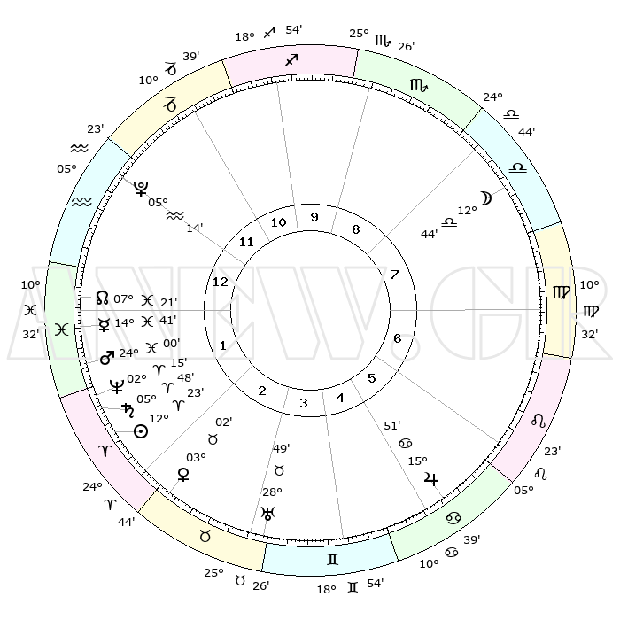 | | ΘΕΣΕΙΣ ΠΛΑΝΗΤΩΝ ΑΣΤΡΟΛΟΓΙΚΟΥ ΧΑΡΤΗ ΤΗΣ ΣΤΙΓΜΗΣ ΑΥΤΗΣ | | | | Πλανήτης | Ζώδιο | Μοίρες | Δεκαήμ. | Σε οίκο | Απόκλιση | | Ακμές των οίκων | | Ηλιος | Κριός | 12°20' | Δεύτερο | 2 | 04 N 52 | | 1ος | 10°53' | Υδροχόος | | Σελήνη | Ζυγός | 12°01' | Δεύτερο | 8 | 07 S 23 | | 2ος | 26°20' | Ιχθείς | | Ερμής | Ιχθείς | 14°38' | Δεύτερο | 1 | 07 S 24 | | 3ος | 02°51' | Ταύρος | | Αφροδίτη | Ταύρος | 02°58' | Πρώτο | 3 | 12 N 07 | | 4ος | 29°35' | Ταύρος | | Αρης | Ιχθείς | 23°58' | Τρίτο | 1 | 03 S 21 | | 5ος | 21°42' | Δίδυμοι | | Δίας | Καρκίνος | 15°51' | Δεύτερο | 6 | 22 N 52 | | 6ος | 13°40' | Καρκίνος | | Κρόνος | Κριός | 05°48' | Πρώτο | 2 | 00 N 21 | | 7ος | 10°53' | Λέων | | Ουρανός | Ταύρος | 28°49' | Τρίτο | 3 | 19 N 43 | | 8ος | 26°20' | Παρθένος | | Ποσειδώνας | Κριός | 02°15' | Πρώτο | 2 | 00 S 18 | | 9ος | 02°51' | Σκορπιός | | Πλούτωνας | Υδροχόος | 05°14' | Πρώτο | 12 | 22 S 47 | | 10ος | 29°35' | Σκορπιός | | Β. Δεσμός | Ιχθείς | 07°21' | Πρώτο | 1 | 08 S 49 | | 11ος | 21°42' | Τοξότης | | Ωροσκόπος | Υδροχόος | 10°53' | Δεύτερο | | | 12ος | 13°40' | Αιγόκερως | | Μεσουράνημα | Σκορπιός | 29°35' | Τρίτο | | | |