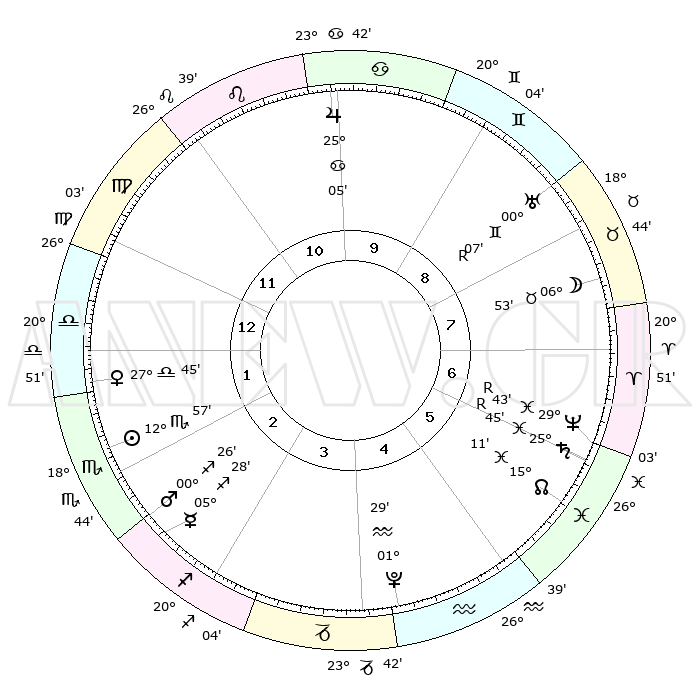 | | ΘΕΣΕΙΣ ΠΛΑΝΗΤΩΝ ΑΣΤΡΟΛΟΓΙΚΟΥ ΧΑΡΤΗ ΤΗΣ ΣΤΙΓΜΗΣ ΑΥΤΗΣ | | | | Πλανήτης | Ζώδιο | Μοίρες | Δεκαήμ. | Σε οίκο | Απόκλιση | | Ακμές των οίκων | | Ηλιος | Σκορπιός | 12°52' | Δεύτερο | 2 | 15 S 42 | | 1ος | 24°53' | Παρθένος | | Σελήνη | Ταύρος | 05°32' | Πρώτο | 8 | 16 N 58 | | 2ος | 21°05' | Ζυγός | | Ερμής | Τοξότης | 05°25' | Πρώτο | 3 | 23 S 58 | | 3ος | 21°18' | Σκορπιός | | Αφροδίτη | Ζυγός | 27°38' | Τρίτο | 2 | 09 S 18 | | 4ος | 24°15' | Τοξότης | | Αρης | Τοξότης | 00°22' | Πρώτο | 3 | 20 S 39 | | 5ος | 27°18' | Αιγόκερως | | Δίας | Καρκίνος | 25°05' | Τρίτο | 10 | 21 N 12 | | 6ος | 27°56' | Υδροχόος | | Κρόνος | Ιχθείς | 25°45'R | Τρίτο | 7 | 03 S 56 | | 7ος | 24°53' | Ιχθείς | | Ουρανός | Δίδυμοι | 00°07'R | Πρώτο | 9 | 19 N 58 | | 8ος | 21°05' | Κριός | | Ποσειδώνας | Ιχθείς | 29°43'R | Τρίτο | 7 | 01 S 22 | | 9ος | 21°18' | Ταύρος | | Πλούτωνας | Υδροχόος | 01°29' | Πρώτο | 5 | 23 S 30 | | 10ος | 24°15' | Δίδυμοι | | Β. Δεσμός | Ιχθείς | 15°11' | Δεύτερο | 6 | 05 S 50 | | 11ος | 27°18' | Καρκίνος | | Ωροσκόπος | Παρθένος | 24°53' | Τρίτο | | | 12ος | 27°56' | Λέων | | Μεσουράνημα | Δίδυμοι | 24°15' | Τρίτο | | | |