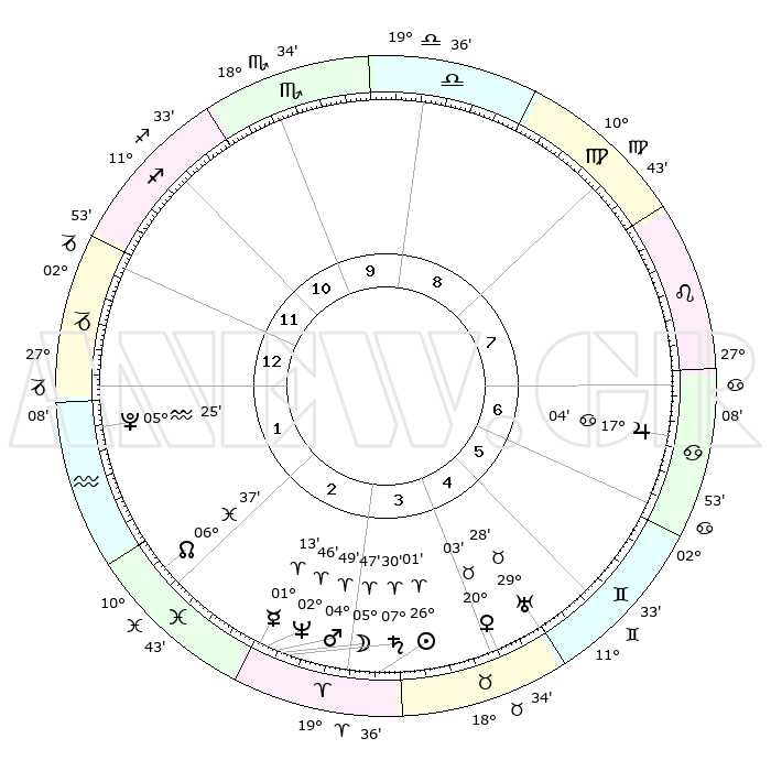 | | ΘΕΣΕΙΣ ΠΛΑΝΗΤΩΝ ΑΣΤΡΟΛΟΓΙΚΟΥ ΧΑΡΤΗ ΤΗΣ ΣΤΙΓΜΗΣ ΑΥΤΗΣ | | | | Πλανήτης | Ζώδιο | Μοίρες | Δεκαήμ. | Σε οίκο | Απόκλιση | | Ακμές των οίκων | | Ηλιος | Κριός | 25°58' | Τρίτο | 3 | 10 N 02 | | 1ος | 06°24' | Αιγόκερως | | Σελήνη | Κριός | 04°60' | Πρώτο | 3 | 04 N 07 | | 2ος | 15°11' | Υδροχόος | | Ερμής | Κριός | 01°09' | Πρώτο | 3 | 01 S 57 | | 3ος | 25°28' | Ιχθείς | | Αφροδίτη | Ταύρος | 19°59' | Δεύτερο | 4 | 17 N 56 | | 4ος | 28°19' | Κριός | | Αρης | Κριός | 04°46' | Πρώτο | 3 | 01 N 00 | | 5ος | 23°40' | Ταύρος | | Δίας | Καρκίνος | 17°04' | Δεύτερο | 7 | 22 N 43 | | 6ος | 15°07' | Δίδυμοι | | Κρόνος | Κριός | 07°30' | Πρώτο | 3 | 01 N 00 | | 7ος | 06°24' | Καρκίνος | | Ουρανός | Ταύρος | 29°28' | Τρίτο | 5 | 19 N 52 | | 8ος | 15°11' | Λέων | | Ποσειδώνας | Κριός | 02°45' | Πρώτο | 3 | 00 S 07 | | 9ος | 25°28' | Παρθένος | | Πλούτωνας | Υδροχόος | 05°25' | Πρώτο | 1 | 22 S 47 | | 10ος | 28°19' | Ζυγός | | Β. Δεσμός | Ιχθείς | 06°37' | Πρώτο | 2 | 09 S 05 | | 11ος | 23°40' | Σκορπιός | | Ωροσκόπος | Αιγόκερως | 06°24' | Πρώτο | | | 12ος | 15°07' | Τοξότης | | Μεσουράνημα | Ζυγός | 28°19' | Τρίτο | | | |