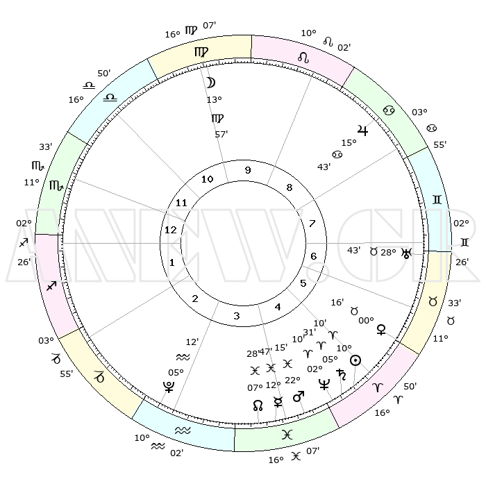 | | ΘΕΣΕΙΣ ΠΛΑΝΗΤΩΝ ΑΣΤΡΟΛΟΓΙΚΟΥ ΧΑΡΤΗ ΤΗΣ ΣΤΙΓΜΗΣ ΑΥΤΗΣ | | | | Πλανήτης | Ζώδιο | Μοίρες | Δεκαήμ. | Σε οίκο | Απόκλιση | | Ακμές των οίκων | | Ηλιος | Κριός | 10°07' | Δεύτερο | 5 | 04 N 00 | | 1ος | 14°16' | Σκορπιός | | Σελήνη | Παρθένος | 13°08' | Δεύτερο | 10 | 06 N 16 | | 2ος | 13°41' | Τοξότης | | Ερμής | Ιχθείς | 12°44' | Δεύτερο | 4 | 07 S 48 | | 3ος | 17°05' | Αιγόκερως | | Αφροδίτη | Ταύρος | 00°11' | Πρώτο | 6 | 11 N 05 | | 4ος | 22°18' | Υδροχόος | | Αρης | Ιχθείς | 22°12' | Τρίτο | 4 | 04 S 03 | | 5ος | 24°46' | Ιχθείς | | Δίας | Καρκίνος | 15°42' | Δεύτερο | 8 | 22 N 53 | | 6ος | 21°54' | Κριός | | Κρόνος | Κριός | 05°31' | Πρώτο | 5 | 00 N 14 | | 7ος | 14°16' | Ταύρος | | Ουρανός | Ταύρος | 28°43' | Τρίτο | 7 | 19 N 42 | | 8ος | 13°41' | Δίδυμοι | | Ποσειδώνας | Κριός | 02°10' | Πρώτο | 5 | 00 S 20 | | 9ος | 17°05' | Καρκίνος | | Πλούτωνας | Υδροχόος | 05°12' | Πρώτο | 3 | 22 S 47 | | 10ος | 22°18' | Λέων | | Β. Δεσμός | Ιχθείς | 07°28' | Πρώτο | 4 | 08 S 46 | | 11ος | 24°46' | Παρθένος | | Ωροσκόπος | Σκορπιός | 14°16' | Δεύτερο | | | 12ος | 21°54' | Ζυγός | | Μεσουράνημα | Λέων | 22°18' | Τρίτο | | | |