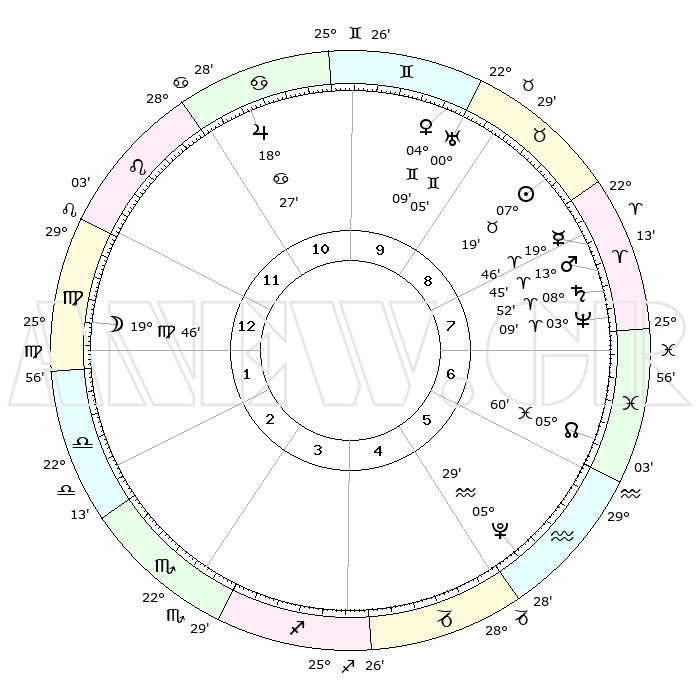 | | ΘΕΣΕΙΣ ΠΛΑΝΗΤΩΝ ΑΣΤΡΟΛΟΓΙΚΟΥ ΧΑΡΤΗ ΤΗΣ ΣΤΙΓΜΗΣ ΑΥΤΗΣ | | | | Πλανήτης | Ζώδιο | Μοίρες | Δεκαήμ. | Σε οίκο | Απόκλιση | | Ακμές των οίκων | | Ηλιος | Ταύρος | 07°15' | Πρώτο | 9 | 13 N 56 | | 1ος | 07°21' | Παρθένος | | Σελήνη | Παρθένος | 18°58' | Δεύτερο | 1 | 03 N 25 | | 2ος | 01°58' | Ζυγός | | Ερμής | Κριός | 19°39' | Δεύτερο | 8 | 05 N 36 | | 3ος | 01°14' | Σκορπιός | | Αφροδίτη | Δίδυμοι | 04°04' | Πρώτο | 9 | 21 N 41 | | 4ος | 04°12' | Τοξότης | | Αρης | Κριός | 13°42' | Δεύτερο | 8 | 04 N 34 | | 5ος | 07°56' | Αιγόκερως | | Δίας | Καρκίνος | 18°27' | Δεύτερο | 11 | 22 N 33 | | 6ος | 09°22' | Υδροχόος | | Κρόνος | Κριός | 08°52' | Πρώτο | 8 | 01 N 31 | | 7ος | 07°21' | Ιχθείς | | Ουρανός | Δίδυμοι | 00°05' | Πρώτο | 9 | 20 N 00 | | 8ος | 01°58' | Κριός | | Ποσειδώνας | Κριός | 03°09' | Πρώτο | 8 | 00 N 03 | | 9ος | 01°14' | Ταύρος | | Πλούτωνας | Υδροχόος | 05°29' | Πρώτο | 5 | 22 S 48 | | 10ος | 04°12' | Δίδυμοι | | Β. Δεσμός | Ιχθείς | 06°00' | Πρώτο | 6 | 09 S 18 | | 11ος | 07°55' | Καρκίνος | | Ωροσκόπος | Παρθένος | 07°21' | Πρώτο | | | 12ος | 09°22' | Λέων | | Μεσουράνημα | Δίδυμοι | 04°12' | Πρώτο | | | |