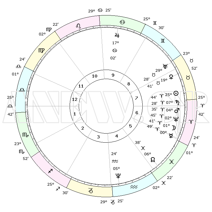 | | ΘΕΣΕΙΣ ΠΛΑΝΗΤΩΝ ΑΣΤΡΟΛΟΓΙΚΟΥ ΧΑΡΤΗ ΤΗΣ ΣΤΙΓΜΗΣ ΑΥΤΗΣ | | | | Πλανήτης | Ζώδιο | Μοίρες | Δεκαήμ. | Σε οίκο | Απόκλιση | | Ακμές των οίκων | | Ηλιος | Κριός | 25°41' | Τρίτο | 7 | 09 N 55 | | 1ος | 07°46' | Ζυγός | | Σελήνη | Κριός | 00°49' | Πρώτο | 6 | 02 N 09 | | 2ος | 04°53' | Σκορπιός | | Ερμής | Κριός | 00°43' | Πρώτο | 6 | 02 S 06 | | 3ος | 05°37' | Τοξότης | | Αφροδίτη | Ταύρος | 19°37' | Δεύτερο | 8 | 17 N 50 | | 4ος | 08°45' | Αιγόκερως | | Αρης | Κριός | 04°32' | Πρώτο | 6 | 00 N 54 | | 5ος | 11°40' | Υδροχόος | | Δίας | Καρκίνος | 17°02' | Δεύτερο | 10 | 22 N 44 | | 6ος | 11°47' | Ιχθείς | | Κρόνος | Κριός | 07°28' | Πρώτο | 6 | 00 N 59 | | 7ος | 07°46' | Κριός | | Ουρανός | Ταύρος | 29°27' | Τρίτο | 8 | 19 N 52 | | 8ος | 04°53' | Ταύρος | | Ποσειδώνας | Κριός | 02°45' | Πρώτο | 6 | 00 S 07 | | 9ος | 05°37' | Δίδυμοι | | Πλούτωνας | Υδροχόος | 05°24' | Πρώτο | 4 | 22 S 47 | | 10ος | 08°45' | Καρκίνος | | Β. Δεσμός | Ιχθείς | 06°38' | Πρώτο | 5 | 09 S 05 | | 11ος | 11°40' | Λέων | | Ωροσκόπος | Ζυγός | 07°46' | Πρώτο | | | 12ος | 11°47' | Παρθένος | | Μεσουράνημα | Καρκίνος | 08°45' | Πρώτο | | | |