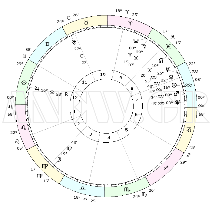 | | ΘΕΣΕΙΣ ΠΛΑΝΗΤΩΝ ΑΣΤΡΟΛΟΓΙΚΟΥ ΧΑΡΤΗ ΤΗΣ ΣΤΙΓΜΗΣ ΑΥΤΗΣ | | | | Πλανήτης | Ζώδιο | Μοίρες | Δεκαήμ. | Σε οίκο | Απόκλιση | | Ακμές των οίκων | | Ηλιος | Υδροχόος | 15°43' | Δεύτερο | 8 | 16 S 07 | | 1ος | 10°08' | Καρκίνος | | Σελήνη | Παρθένος | 18°48' | Δεύτερο | 3 | 03 N 36 | | 2ος | 00°34' | Λέων | | Ερμής | Υδροχόος | 25°45' | Τρίτο | 9 | 14 S 27 | | 3ος | 23°12' | Λέων | | Αφροδίτη | Υδροχόος | 22°38' | Τρίτο | 8 | 15 S 18 | | 4ος | 21°12' | Παρθένος | | Αρης | Υδροχόος | 09°30' | Πρώτο | 8 | 18 S 53 | | 5ος | 26°29' | Ζυγός | | Δίας | Καρκίνος | 16°58'R | Δεύτερο | 1 | 22 N 40 | | 6ος | 05°25' | Τοξότης | | Κρόνος | Ιχθείς | 29°07' | Τρίτο | 10 | 02 S 21 | | 7ος | 10°08' | Αιγόκερως | | Ουρανός | Ταύρος | 27°27' | Τρίτο | 11 | 19 N 24 | | 8ος | 00°34' | Υδροχόος | | Ποσειδώνας | Κριός | 00°15' | Πρώτο | 10 | 01 S 07 | | 9ος | 23°12' | Υδροχόος | | Πλούτωνας | Υδροχόος | 03°49' | Πρώτο | 8 | 23 S 00 | | 10ος | 21°12' | Ιχθείς | | Β. Δεσμός | Ιχθείς | 10°20' | Δεύτερο | 9 | 07 S 41 | | 11ος | 26°29' | Κριός | | Ωροσκόπος | Καρκίνος | 10°08' | Δεύτερο | | | 12ος | 05°25' | Δίδυμοι | | Μεσουράνημα | Ιχθείς | 21°12' | Τρίτο | | | |