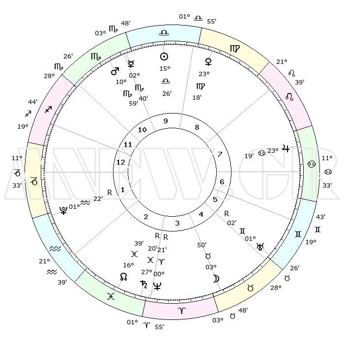 | ΘΕΣΕΙΣ ΠΛΑΝΗΤΩΝ ΑΣΤΡΟΛΟΓΙΚΟΥ ΧΑΡΤΗ ΤΗΣ ΣΤΙΓΜΗΣ ΑΥΤΗΣ | | Πλανήτης | Ζώδιο | Μοίρες | Δεκαήμ. | Σε οίκο | Απόκλιση | | Ακμές των οίκων | Ηλιος | Ζυγός | 15°21' | Δεύτερο | 10 | 06 S 03 | | 1ος | 13°23' | Τοξότης | Σελήνη | Ταύρος | 02°32' | Πρώτο | 5 | 15 N 46 | | 2ος | 16°45' | Αιγόκερως | Ερμής | Σκορπιός | 02°33' | Πρώτο | 11 | 13 S 17 | | 3ος | 24°42' | Υδροχόος | Αφροδίτη | Παρθένος | 23°12' | Τρίτο | 9 | 04 N 01 | | 4ος | 00°31' | Κριός | Αρης | Σκορπιός | 10°56' | Δεύτερο | 11 | 15 S 15 | | 5ος | 29°35' | Κριός | Δίας | Καρκίνος | 23°18' | Τρίτο | 8 | 21 N 27 | | 6ος | 22°55' | Ταύρος | Κρόνος | Ιχθείς | 27°21'R | Τρίτο | 3 | 03 S 21 | | 7ος | 13°23' | Δίδυμοι | Ουρανός | Δίδυμοι | 01°02'R | Πρώτο | 6 | 20 N 09 | | 8ος | 16°45' | Καρκίνος | Ποσειδώνας | Κριός | 00°21'R | Πρώτο | 3 | 01 S 07 | | 9ος | 24°42' | Λέων | Πλούτωνας | Υδροχόος | 01°22'R | Πρώτο | 2 | 23 S 32 | | 10ος | 00°31' | Ζυγός | Β. Δεσμός | Ιχθείς | 16°39' | Δεύτερο | 3 | 05 S 16 | | 11ος | 29°35' | Ζυγός | Ωροσκόπος | Τοξότης | 13°23' | Δεύτερο | | | 12ος | 22°55' | Σκορπιός | Μεσουράνημα | Ζυγός | 00°31' | Πρώτο | | | |