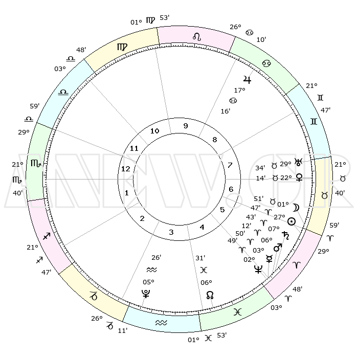 | | ΘΕΣΕΙΣ ΠΛΑΝΗΤΩΝ ΑΣΤΡΟΛΟΓΙΚΟΥ ΧΑΡΤΗ ΤΗΣ ΣΤΙΓΜΗΣ ΑΥΤΗΣ | | | | Πλανήτης | Ζώδιο | Μοίρες | Δεκαήμ. | Σε οίκο | Απόκλιση | | Ακμές των οίκων | | Ηλιος | Κριός | 27°43' | Τρίτο | 6 | 10 N 40 | | 1ος | 05°23' | Σκορπιός | | Σελήνη | Ταύρος | 01°01' | Πρώτο | 6 | 15 N 39 | | 2ος | 04°08' | Τοξότης | | Ερμής | Κριός | 03°45' | Πρώτο | 5 | 00 S 56 | | 3ος | 06°33' | Αιγόκερως | | Αφροδίτη | Ταύρος | 22°10' | Τρίτο | 7 | 18 N 36 | | 4ος | 11°07' | Υδροχόος | | Αρης | Κριός | 06°10' | Πρώτο | 5 | 01 N 33 | | 5ος | 13°56' | Ιχθείς | | Δίας | Καρκίνος | 17°15' | Δεύτερο | 9 | 22 N 42 | | 6ος | 12°05' | Κριός | | Κρόνος | Κριός | 07°43' | Πρώτο | 5 | 01 N 05 | | 7ος | 05°23' | Ταύρος | | Ουρανός | Ταύρος | 29°34' | Τρίτο | 7 | 19 N 53 | | 8ος | 04°08' | Δίδυμοι | | Ποσειδώνας | Κριός | 02°49' | Πρώτο | 5 | 00 S 05 | | 9ος | 06°33' | Καρκίνος | | Πλούτωνας | Υδροχόος | 05°26' | Πρώτο | 3 | 22 S 47 | | 10ος | 11°07' | Λέων | | Β. Δεσμός | Ιχθείς | 06°31' | Πρώτο | 4 | 09 S 07 | | 11ος | 13°56' | Παρθένος | | Ωροσκόπος | Σκορπιός | 05°23' | Πρώτο | | | 12ος | 12°05' | Ζυγός | | Μεσουράνημα | Λέων | 11°07' | Δεύτερο | | | |