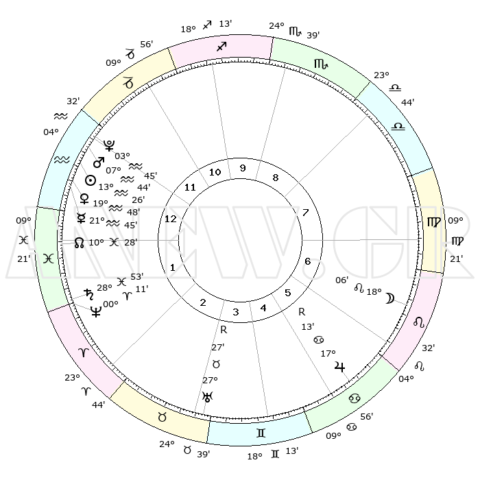 | | ΘΕΣΕΙΣ ΠΛΑΝΗΤΩΝ ΑΣΤΡΟΛΟΓΙΚΟΥ ΧΑΡΤΗ ΤΗΣ ΣΤΙΓΜΗΣ ΑΥΤΗΣ | | | | Πλανήτης | Ζώδιο | Μοίρες | Δεκαήμ. | Σε οίκο | Απόκλιση | | Ακμές των οίκων | | Ηλιος | Υδροχόος | 13°21' | Δεύτερο | 1 | 16 S 48 | | 1ος | 02°08' | Υδροχόος | | Σελήνη | Λέων | 17°03' | Δεύτερο | 7 | 17 N 35 | | 2ος | 16°34' | Ιχθείς | | Ερμής | Υδροχόος | 21°37' | Τρίτο | 1 | 16 S 00 | | 3ος | 24°40' | Κριός | | Αφροδίτη | Υδροχόος | 19°42' | Δεύτερο | 1 | 16 S 13 | | 4ος | 22°46' | Ταύρος | | Αρης | Υδροχόος | 07°41' | Πρώτο | 1 | 19 S 21 | | 5ος | 15°23' | Δίδυμοι | | Δίας | Καρκίνος | 17°13'R | Δεύτερο | 6 | 22 N 38 | | 6ος | 06°53' | Καρκίνος | | Κρόνος | Ιχθείς | 28°53' | Τρίτο | 2 | 02 S 26 | | 7ος | 02°08' | Λέων | | Ουρανός | Ταύρος | 27°28'R | Τρίτο | 4 | 19 N 24 | | 8ος | 16°34' | Παρθένος | | Ποσειδώνας | Κριός | 00°11' | Πρώτο | 2 | 01 S 08 | | 9ος | 24°40' | Ζυγός | | Πλούτωνας | Υδροχόος | 03°44' | Πρώτο | 1 | 23 S 01 | | 10ος | 22°46' | Σκορπιός | | Β. Δεσμός | Ιχθείς | 10°28' | Δεύτερο | 1 | 07 S 39 | | 11ος | 15°23' | Τοξότης | | Ωροσκόπος | Υδροχόος | 02°08' | Πρώτο | | | 12ος | 06°53' | Αιγόκερως | | Μεσουράνημα | Σκορπιός | 22°46' | Τρίτο | | | |