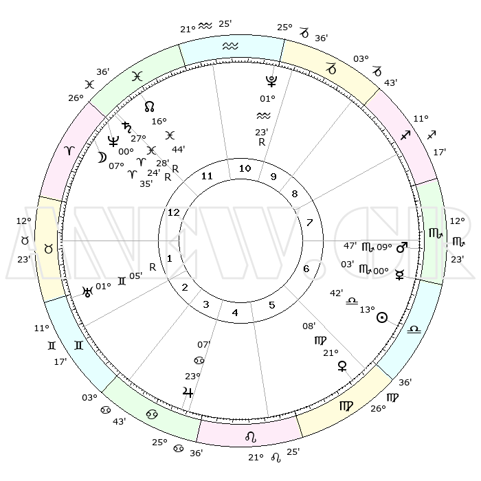 | ΘΕΣΕΙΣ ΠΛΑΝΗΤΩΝ ΑΣΤΡΟΛΟΓΙΚΟΥ ΧΑΡΤΗ ΤΗΣ ΣΤΙΓΜΗΣ ΑΥΤΗΣ | | Πλανήτης | Ζώδιο | Μοίρες | Δεκαήμ. | Σε οίκο | Απόκλιση | | Ακμές των οίκων | Ηλιος | Ζυγός | 13°37' | Δεύτερο | 7 | 05 S 22 | | 1ος | 23°27' | Ιχθείς | Σελήνη | Κριός | 06°17' | Πρώτο | 1 | 03 N 59 | | 2ος | 05°15' | Ταύρος | Ερμής | Ζυγός | 29°55' | Τρίτο | 7 | 12 S 10 | | 3ος | 03°42' | Δίδυμοι | Αφροδίτη | Παρθένος | 21°02' | Τρίτο | 6 | 04 N 51 | | 4ος | 26°19' | Δίδυμοι | Αρης | Σκορπιός | 09°43' | Πρώτο | 8 | 14 S 51 | | 5ος | 18°22' | Καρκίνος | Δίας | Καρκίνος | 23°07' | Τρίτο | 5 | 21 N 29 | | 6ος | 14°48' | Λέων | Κρόνος | Ιχθείς | 27°28'R | Τρίτο | 1 | 03 S 19 | | 7ος | 23°27' | Παρθένος | Ουρανός | Δίδυμοι | 01°05'R | Πρώτο | 2 | 20 N 10 | | 8ος | 05°15' | Σκορπιός | Ποσειδώνας | Κριός | 00°24'R | Πρώτο | 1 | 01 S 06 | | 9ος | 03°42' | Τοξότης | Πλούτωνας | Υδροχόος | 01°23'R | Πρώτο | 11 | 23 S 32 | | 10ος | 26°19' | Τοξότης | Β. Δεσμός | Ιχθείς | 16°45' | Δεύτερο | 12 | 05 S 14 | | 11ος | 18°22' | Αιγόκερως | Ωροσκόπος | Ιχθείς | 23°27' | Τρίτο | | | 12ος | 14°48' | Υδροχόος | Μεσουράνημα | Τοξότης | 26°19' | Τρίτο | | | |