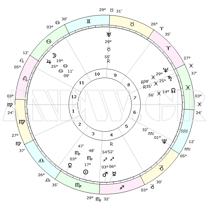 | | ΘΕΣΕΙΣ ΠΛΑΝΗΤΩΝ ΑΣΤΡΟΛΟΓΙΚΟΥ ΧΑΡΤΗ ΤΗΣ ΣΤΙΓΜΗΣ ΑΥΤΗΣ | | | | Πλανήτης | Ζώδιο | Μοίρες | Δεκαήμ. | Σε οίκο | Απόκλιση | | Ακμές των οίκων | | Ηλιος | Σκορπιός | 17°42' | Δεύτερο | 4 | 17 S 06 | | 1ος | 05°25' | Λέων | | Σελήνη | Καρκίνος | 17°49' | Δεύτερο | 12 | 26 N 32 | | 2ος | 26°51' | Λέων | | Ερμής | Τοξότης | 06°52' | Πρώτο | 5 | 23 S 46 | | 3ος | 22°38' | Παρθένος | | Αφροδίτη | Σκορπιός | 03°40' | Πρώτο | 4 | 11 S 29 | | 4ος | 24°17' | Ζυγός | | Αρης | Τοξότης | 03°50' | Πρώτο | 5 | 21 S 23 | | 5ος | 00°08' | Τοξότης | | Δίας | Καρκίνος | 25°09' | Τρίτο | 12 | 21 N 12 | | 6ος | 04°58' | Αιγόκερως | | Κρόνος | Ιχθείς | 25°35'R | Τρίτο | 9 | 04 S 00 | | 7ος | 05°25' | Υδροχόος | | Ουρανός | Ταύρος | 29°55'R | Τρίτο | 10 | 19 N 56 | | 8ος | 26°51' | Υδροχόος | | Ποσειδώνας | Ιχθείς | 29°38'R | Τρίτο | 9 | 01 S 24 | | 9ος | 22°38' | Ιχθείς | | Πλούτωνας | Υδροχόος | 01°32' | Πρώτο | 6 | 23 S 29 | | 10ος | 24°17' | Κριός | | Β. Δεσμός | Ιχθείς | 14°56' | Δεύτερο | 8 | 05 S 56 | | 11ος | 00°08' | Δίδυμοι | | Ωροσκόπος | Λέων | 05°25' | Πρώτο | | | 12ος | 04°58' | Καρκίνος | | Μεσουράνημα | Κριός | 24°17' | Τρίτο | | | |