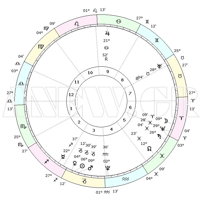 | | ΘΕΣΕΙΣ ΠΛΑΝΗΤΩΝ ΑΣΤΡΟΛΟΓΙΚΟΥ ΧΑΡΤΗ ΤΗΣ ΣΤΙΓΜΗΣ ΑΥΤΗΣ | | | | Πλανήτης | Ζώδιο | Μοίρες | Δεκαήμ. | Σε οίκο | Απόκλιση | | Ακμές των οίκων | | Ηλιος | Αιγόκερως | 06°26' | Πρώτο | 4 | 23 S 17 | | 1ος | 05°37' | Ζυγός | | Σελήνη | Κριός | 08°08' | Πρώτο | 7 | 05 N 20 | | 2ος | 02°35' | Σκορπιός | | Ερμής | Τοξότης | 22°31' | Τρίτο | 3 | 23 S 19 | | 3ος | 03°14' | Τοξότης | | Αφροδίτη | Αιγόκερως | 04°06' | Πρώτο | 3 | 23 S 43 | | 4ος | 06°18' | Αιγόκερως | | Αρης | Αιγόκερως | 09°35' | Πρώτο | 4 | 23 S 57 | | 5ος | 09°14' | Υδροχόος | | Δίας | Καρκίνος | 21°53'R | Τρίτο | 10 | 21 N 53 | | 6ος | 09°27' | Ιχθείς | | Κρόνος | Ιχθείς | 26°04' | Τρίτο | 6 | 03 S 39 | | 7ος | 05°37' | Κριός | | Ουρανός | Ταύρος | 28°04'R | Τρίτο | 8 | 19 N 32 | | 8ος | 02°35' | Ταύρος | | Ποσειδώνας | Ιχθείς | 29°28' | Τρίτο | 6 | 01 S 26 | | 9ος | 03°14' | Δίδυμοι | | Πλούτωνας | Υδροχόος | 02°36' | Πρώτο | 4 | 23 S 15 | | 10ος | 06°18' | Καρκίνος | | Β. Δεσμός | Ιχθείς | 12°23' | Δεύτερο | 6 | 06 S 55 | | 11ος | 09°14' | Λέων | | Ωροσκόπος | Ζυγός | 05°37' | Πρώτο | | | 12ος | 09°27' | Παρθένος | | Μεσουράνημα | Καρκίνος | 06°18' | Πρώτο | | | |