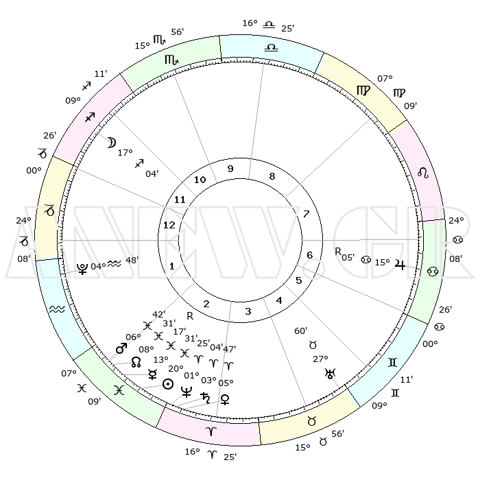 | | ΘΕΣΕΙΣ ΠΛΑΝΗΤΩΝ ΑΣΤΡΟΛΟΓΙΚΟΥ ΧΑΡΤΗ ΤΗΣ ΣΤΙΓΜΗΣ ΑΥΤΗΣ | | | | Πλανήτης | Ζώδιο | Μοίρες | Δεκαήμ. | Σε οίκο | Απόκλιση | | Ακμές των οίκων | | Ηλιος | Ιχθείς | 20°27' | Τρίτο | 3 | 03 S 47 | | 1ος | 02°14' | Αιγόκερως | | Σελήνη | Τοξότης | 16°22' | Δεύτερο | 12 | 27 S 56 | | 2ος | 09°57' | Υδροχόος | | Ερμής | Ιχθείς | 13°20'R | Δεύτερο | 2 | 03 S 34 | | 3ος | 20°06' | Ιχθείς | | Αφροδίτη | Κριός | 05°42' | Πρώτο | 3 | 01 N 12 | | 4ος | 23°40' | Κριός | | Αρης | Ιχθείς | 06°39' | Πρώτο | 2 | 10 S 05 | | 5ος | 19°38' | Ταύρος | | Δίας | Καρκίνος | 15°05'R | Δεύτερο | 7 | 22 N 56 | | 6ος | 11°18' | Δίδυμοι | | Κρόνος | Κριός | 03°03' | Πρώτο | 3 | 00 S 44 | | 7ος | 02°14' | Καρκίνος | | Ουρανός | Ταύρος | 27°59' | Τρίτο | 5 | 19 N 32 | | 8ος | 09°57' | Λέων | | Ποσειδώνας | Κριός | 01°25' | Πρώτο | 3 | 00 S 38 | | 9ος | 20°06' | Παρθένος | | Πλούτωνας | Υδροχόος | 04°48' | Πρώτο | 1 | 22 S 50 | | 10ος | 23°40' | Ζυγός | | Β. Δεσμός | Ιχθείς | 08°31' | Πρώτο | 2 | 08 S 23 | | 11ος | 19°38' | Σκορπιός | | Ωροσκόπος | Αιγόκερως | 02°14' | Πρώτο | | | 12ος | 11°18' | Τοξότης | | Μεσουράνημα | Ζυγός | 23°40' | Τρίτο | | | |