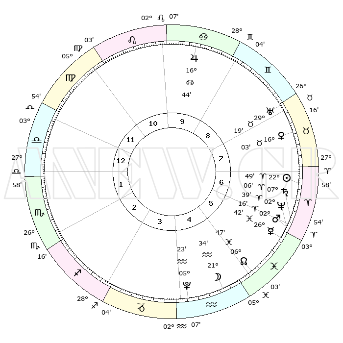 | | ΘΕΣΕΙΣ ΠΛΑΝΗΤΩΝ ΑΣΤΡΟΛΟΓΙΚΟΥ ΧΑΡΤΗ ΤΗΣ ΣΤΙΓΜΗΣ ΑΥΤΗΣ | | | | Πλανήτης | Ζώδιο | Μοίρες | Δεκαήμ. | Σε οίκο | Απόκλιση | | Ακμές των οίκων | | Ηλιος | Κριός | 22°45' | Τρίτο | 7 | 08 N 51 | | 1ος | 06°47' | Ζυγός | | Σελήνη | Υδροχόος | 20°39' | Τρίτο | 5 | 16 S 05 | | 2ος | 03°51' | Σκορπιός | | Ερμής | Ιχθείς | 26°36' | Τρίτο | 6 | 03 S 39 | | 3ος | 04°32' | Τοξότης | | Αφροδίτη | Ταύρος | 15°57' | Δεύτερο | 8 | 16 N 40 | | 4ος | 07°38' | Αιγόκερως | | Αρης | Κριός | 02°13' | Πρώτο | 6 | 00 S 02 | | 5ος | 10°34' | Υδροχόος | | Δίας | Καρκίνος | 16°44' | Δεύτερο | 10 | 22 N 46 | | 6ος | 10°44' | Ιχθείς | | Κρόνος | Κριός | 07°06' | Πρώτο | 7 | 00 N 51 | | 7ος | 06°47' | Κριός | | Ουρανός | Ταύρος | 29°18' | Τρίτο | 8 | 19 N 50 | | 8ος | 03°51' | Ταύρος | | Ποσειδώνας | Κριός | 02°38' | Πρώτο | 6 | 00 S 09 | | 9ος | 04°32' | Δίδυμοι | | Πλούτωνας | Υδροχόος | 05°23' | Πρώτο | 4 | 22 S 47 | | 10ος | 07°38' | Καρκίνος | | Β. Δεσμός | Ιχθείς | 06°47' | Πρώτο | 5 | 09 S 01 | | 11ος | 10°34' | Λέων | | Ωροσκόπος | Ζυγός | 06°47' | Πρώτο | | | 12ος | 10°44' | Παρθένος | | Μεσουράνημα | Καρκίνος | 07°38' | Πρώτο | | | |