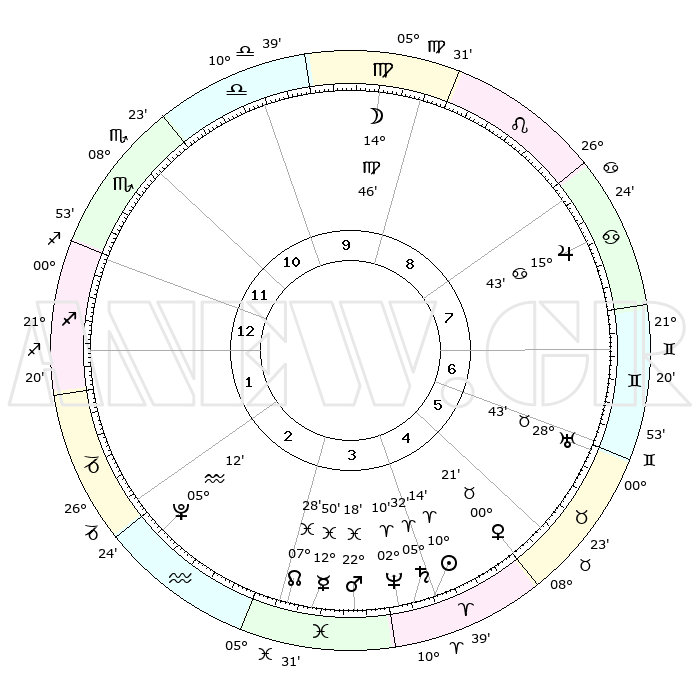 | | ΘΕΣΕΙΣ ΠΛΑΝΗΤΩΝ ΑΣΤΡΟΛΟΓΙΚΟΥ ΧΑΡΤΗ ΤΗΣ ΣΤΙΓΜΗΣ ΑΥΤΗΣ | | | | Πλανήτης | Ζώδιο | Μοίρες | Δεκαήμ. | Σε οίκο | Απόκλιση | | Ακμές των οίκων | | Ηλιος | Κριός | 10°10' | Δεύτερο | 4 | 04 N 02 | | 1ος | 02°26' | Τοξότης | | Σελήνη | Παρθένος | 13°57' | Δεύτερο | 9 | 05 N 53 | | 2ος | 03°55' | Αιγόκερως | | Ερμής | Ιχθείς | 12°47' | Δεύτερο | 3 | 07 S 48 | | 3ος | 10°02' | Υδροχόος | | Αφροδίτη | Ταύρος | 00°16' | Πρώτο | 5 | 11 N 06 | | 4ος | 16°07' | Ιχθείς | | Αρης | Ιχθείς | 22°15' | Τρίτο | 4 | 04 S 02 | | 5ος | 16°50' | Κριός | | Δίας | Καρκίνος | 15°43' | Δεύτερο | 8 | 22 N 53 | | 6ος | 11°33' | Ταύρος | | Κρόνος | Κριός | 05°31' | Πρώτο | 4 | 00 N 14 | | 7ος | 02°26' | Δίδυμοι | | Ουρανός | Ταύρος | 28°43' | Τρίτο | 6 | 19 N 42 | | 8ος | 03°55' | Καρκίνος | | Ποσειδώνας | Κριός | 02°10' | Πρώτο | 4 | 00 S 20 | | 9ος | 10°02' | Λέων | | Πλούτωνας | Υδροχόος | 05°12' | Πρώτο | 2 | 22 S 47 | | 10ος | 16°07' | Παρθένος | | Β. Δεσμός | Ιχθείς | 07°28' | Πρώτο | 3 | 08 S 46 | | 11ος | 16°50' | Ζυγός | | Ωροσκόπος | Τοξότης | 02°26' | Πρώτο | | | 12ος | 11°33' | Σκορπιός | | Μεσουράνημα | Παρθένος | 16°07' | Δεύτερο | | | |
