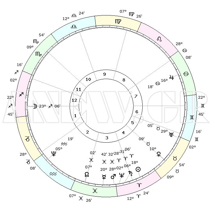 | | ΘΕΣΕΙΣ ΠΛΑΝΗΤΩΝ ΑΣΤΡΟΛΟΓΙΚΟΥ ΧΑΡΤΗ ΤΗΣ ΣΤΙΓΜΗΣ ΑΥΤΗΣ | | | | Πλανήτης | Ζώδιο | Μοίρες | Δεκαήμ. | Σε οίκο | Απόκλιση | | Ακμές των οίκων | | Ηλιος | Κριός | 18°02' | Δεύτερο | 4 | 07 N 04 | | 1ος | 03°58' | Τοξότης | | Σελήνη | Τοξότης | 22°22' | Τρίτο | 1 | 28 S 13 | | 2ος | 05°40' | Αιγόκερως | | Ερμής | Ιχθείς | 20°38' | Τρίτο | 4 | 05 S 42 | | 3ος | 12°03' | Υδροχόος | | Αφροδίτη | Ταύρος | 10°05' | Δεύτερο | 5 | 14 N 42 | | 4ος | 18°08' | Ιχθείς | | Αρης | Ιχθείς | 28°29' | Τρίτο | 4 | 01 S 32 | | 5ος | 18°39' | Κριός | | Δίας | Καρκίνος | 16°18' | Δεύτερο | 8 | 22 N 49 | | 6ος | 13°10' | Ταύρος | | Κρόνος | Κριός | 06°31' | Πρώτο | 4 | 00 N 37 | | 7ος | 03°58' | Δίδυμοι | | Ουρανός | Ταύρος | 29°05' | Τρίτο | 6 | 19 N 47 | | 8ος | 05°40' | Καρκίνος | | Ποσειδώνας | Κριός | 02°28' | Πρώτο | 4 | 00 S 13 | | 9ος | 12°03' | Λέων | | Πλούτωνας | Υδροχόος | 05°19' | Πρώτο | 2 | 22 S 47 | | 10ος | 18°08' | Παρθένος | | Β. Δεσμός | Ιχθείς | 07°02' | Πρώτο | 3 | 08 S 55 | | 11ος | 18°39' | Ζυγός | | Ωροσκόπος | Τοξότης | 03°58' | Πρώτο | | | 12ος | 13°10' | Σκορπιός | | Μεσουράνημα | Παρθένος | 18°08' | Δεύτερο | | | |
