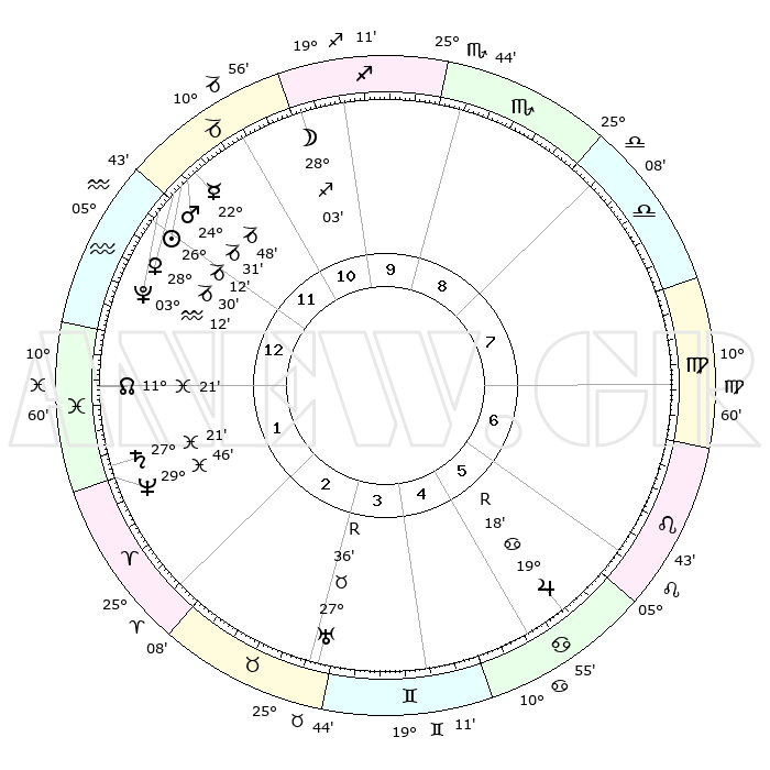 | | ΘΕΣΕΙΣ ΠΛΑΝΗΤΩΝ ΑΣΤΡΟΛΟΓΙΚΟΥ ΧΑΡΤΗ ΤΗΣ ΣΤΙΓΜΗΣ ΑΥΤΗΣ | | | | Πλανήτης | Ζώδιο | Μοίρες | Δεκαήμ. | Σε οίκο | Απόκλιση | | Ακμές των οίκων | | Ηλιος | Αιγόκερως | 26°07' | Τρίτο | 12 | 20 S 55 | | 1ος | 04°55' | Υδροχόος | | Σελήνη | Τοξότης | 27°11' | Τρίτο | 11 | 28 S 18 | | 2ος | 19°45' | Ιχθείς | | Ερμής | Αιγόκερως | 22°41' | Τρίτο | 12 | 23 S 21 | | 3ος | 27°22' | Κριός | | Αφροδίτη | Αιγόκερως | 28°25' | Τρίτο | 12 | 21 S 28 | | 4ος | 25°01' | Ταύρος | | Αρης | Αιγόκερως | 24°28' | Τρίτο | 12 | 22 S 11 | | 5ος | 17°27' | Δίδυμοι | | Δίας | Καρκίνος | 19°19'R | Δεύτερο | 6 | 22 N 19 | | 6ος | 09°04' | Καρκίνος | | Κρόνος | Ιχθείς | 27°21' | Τρίτο | 2 | 03 S 05 | | 7ος | 04°55' | Λέων | | Ουρανός | Ταύρος | 27°37'R | Τρίτο | 4 | 19 N 26 | | 8ος | 19°45' | Παρθένος | | Ποσειδώνας | Ιχθείς | 29°46' | Τρίτο | 2 | 01 S 19 | | 9ος | 27°22' | Ζυγός | | Πλούτωνας | Υδροχόος | 03°12' | Πρώτο | 12 | 23 S 07 | | 10ος | 25°01' | Σκορπιός | | Β. Δεσμός | Ιχθείς | 11°22' | Δεύτερο | 1 | 07 S 18 | | 11ος | 17°27' | Τοξότης | | Ωροσκόπος | Υδροχόος | 04°55' | Πρώτο | | | 12ος | 09°04' | Αιγόκερως | | Μεσουράνημα | Σκορπιός | 25°01' | Τρίτο | | | |