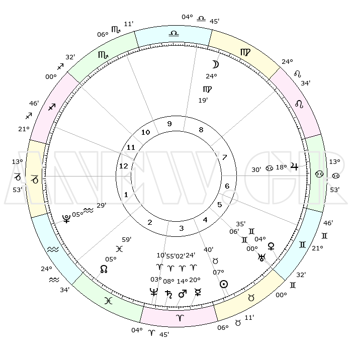 | | ΘΕΣΕΙΣ ΠΛΑΝΗΤΩΝ ΑΣΤΡΟΛΟΓΙΚΟΥ ΧΑΡΤΗ ΤΗΣ ΣΤΙΓΜΗΣ ΑΥΤΗΣ | | | | Πλανήτης | Ζώδιο | Μοίρες | Δεκαήμ. | Σε οίκο | Απόκλιση | | Ακμές των οίκων | | Ηλιος | Ταύρος | 07°37' | Πρώτο | 4 | 14 N 03 | | 1ος | 24°40' | Τοξότης | | Σελήνη | Παρθένος | 23°36' | Τρίτο | 9 | 01 N 13 | | 2ος | 00°30' | Υδροχόος | | Ερμής | Κριός | 20°18' | Τρίτο | 4 | 05 N 52 | | 3ος | 10°01' | Ιχθείς | | Αφροδίτη | Δίδυμοι | 04°31' | Πρώτο | 6 | 21 N 47 | | 4ος | 14°44' | Κριός | | Αρης | Κριός | 13°59' | Δεύτερο | 3 | 04 N 41 | | 5ος | 11°55' | Ταύρος | | Δίας | Καρκίνος | 18°30' | Δεύτερο | 7 | 22 N 32 | | 6ος | 04°07' | Δίδυμοι | | Κρόνος | Κριός | 08°54' | Πρώτο | 3 | 01 N 32 | | 7ος | 24°40' | Δίδυμοι | | Ουρανός | Δίδυμοι | 00°06' | Πρώτο | 5 | 20 N 00 | | 8ος | 00°30' | Λέων | | Ποσειδώνας | Κριός | 03°10' | Πρώτο | 3 | 00 N 03 | | 9ος | 10°01' | Παρθένος | | Πλούτωνας | Υδροχόος | 05°29' | Πρώτο | 2 | 22 S 48 | | 10ος | 14°44' | Ζυγός | | Β. Δεσμός | Ιχθείς | 05°59' | Πρώτο | 2 | 09 S 19 | | 11ος | 11°55' | Σκορπιός | | Ωροσκόπος | Τοξότης | 24°40' | Τρίτο | | | 12ος | 04°07' | Τοξότης | | Μεσουράνημα | Ζυγός | 14°44' | Δεύτερο | | | |