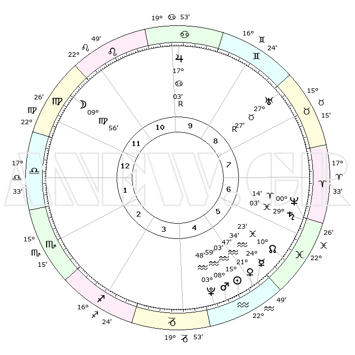 | | ΘΕΣΕΙΣ ΠΛΑΝΗΤΩΝ ΑΣΤΡΟΛΟΓΙΚΟΥ ΧΑΡΤΗ ΤΗΣ ΣΤΙΓΜΗΣ ΑΥΤΗΣ | | | | Πλανήτης | Ζώδιο | Μοίρες | Δεκαήμ. | Σε οίκο | Απόκλιση | | Ακμές των οίκων | | Ηλιος | Υδροχόος | 14°59' | Δεύτερο | 5 | 16 S 20 | | 1ος | 29°57' | Παρθένος | | Σελήνη | Παρθένος | 09°08' | Πρώτο | 12 | 08 N 08 | | 2ος | 26°33' | Ζυγός | | Ερμής | Υδροχόος | 24°28' | Τρίτο | 5 | 14 S 56 | | 3ος | 26°58' | Σκορπιός | | Αφροδίτη | Υδροχόος | 21°43' | Τρίτο | 5 | 15 S 35 | | 4ος | 29°57' | Τοξότης | | Αρης | Υδροχόος | 08°56' | Πρώτο | 5 | 19 S 02 | | 5ος | 02°56' | Υδροχόος | | Δίας | Καρκίνος | 17°03'R | Δεύτερο | 10 | 22 N 39 | | 6ος | 03°22' | Ιχθείς | | Κρόνος | Ιχθείς | 29°02' | Τρίτο | 6 | 02 S 22 | | 7ος | 29°57' | Ιχθείς | | Ουρανός | Ταύρος | 27°27'R | Τρίτο | 9 | 19 N 24 | | 8ος | 26°33' | Κριός | | Ποσειδώνας | Κριός | 00°13' | Πρώτο | 7 | 01 S 07 | | 9ος | 26°59' | Ταύρος | | Πλούτωνας | Υδροχόος | 03°47' | Πρώτο | 5 | 23 S 00 | | 10ος | 29°57' | Δίδυμοι | | Β. Δεσμός | Ιχθείς | 10°23' | Δεύτερο | 6 | 07 S 40 | | 11ος | 02°56' | Λέων | | Ωροσκόπος | Παρθένος | 29°57' | Τρίτο | | | 12ος | 03°22' | Παρθένος | | Μεσουράνημα | Δίδυμοι | 29°57' | Τρίτο | | | |